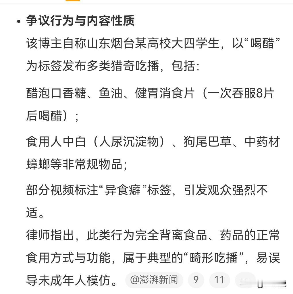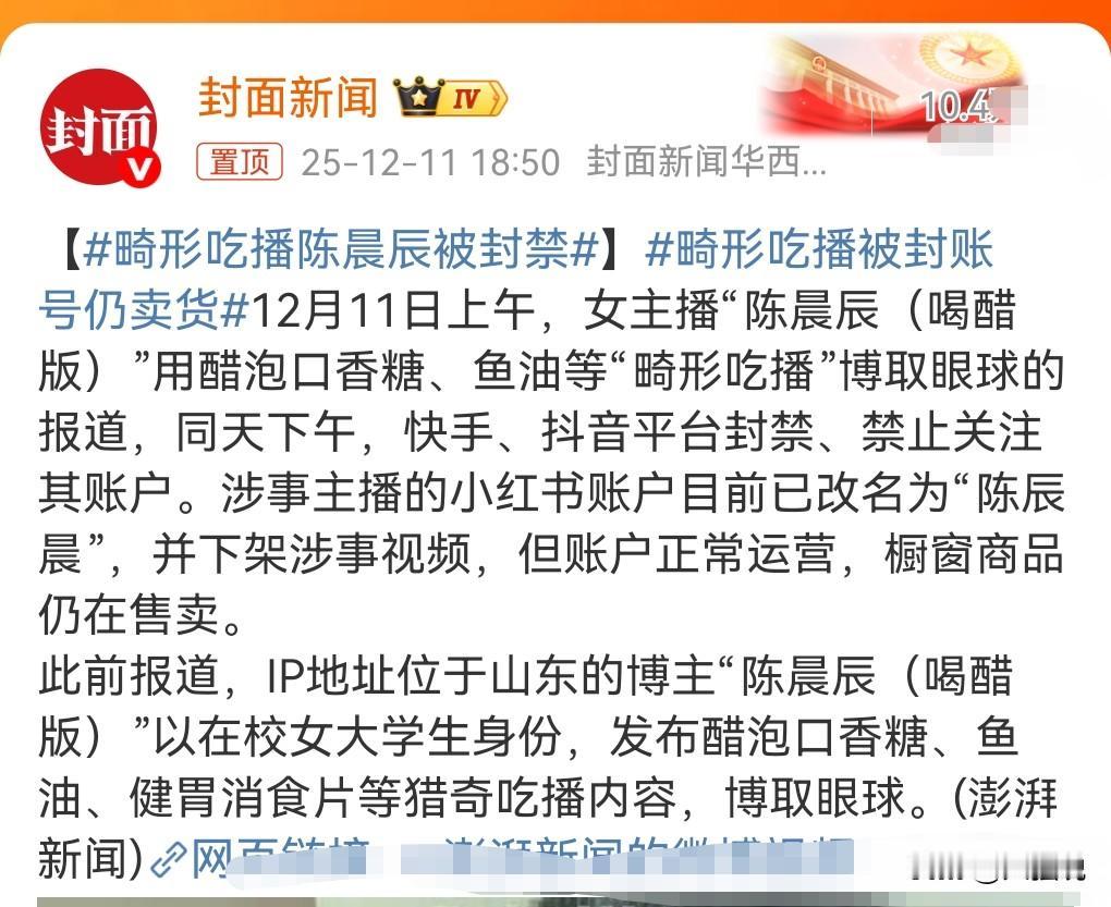 这难道是异食癖赛道吗? 一个女主播竟然用醋泡鱼油、口香糖、健胃消食片等来吸引眼球。 她还吃人尿的沉淀物。 实在是太恶心了。 这真的是非常不好的行为呀。 容易引起未成年人模仿。 她这种没有底线的行为,也已经被平台所关注到。 就是一种畸形吃播。 畸形吃播陈晨辰被封禁。 这真是敲响了警钟啊。 做主播一定要传播正能量。