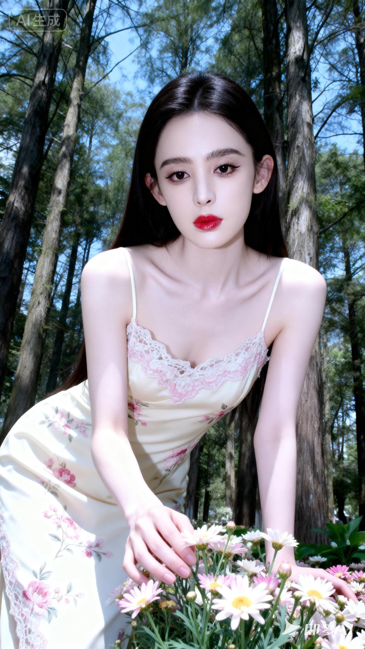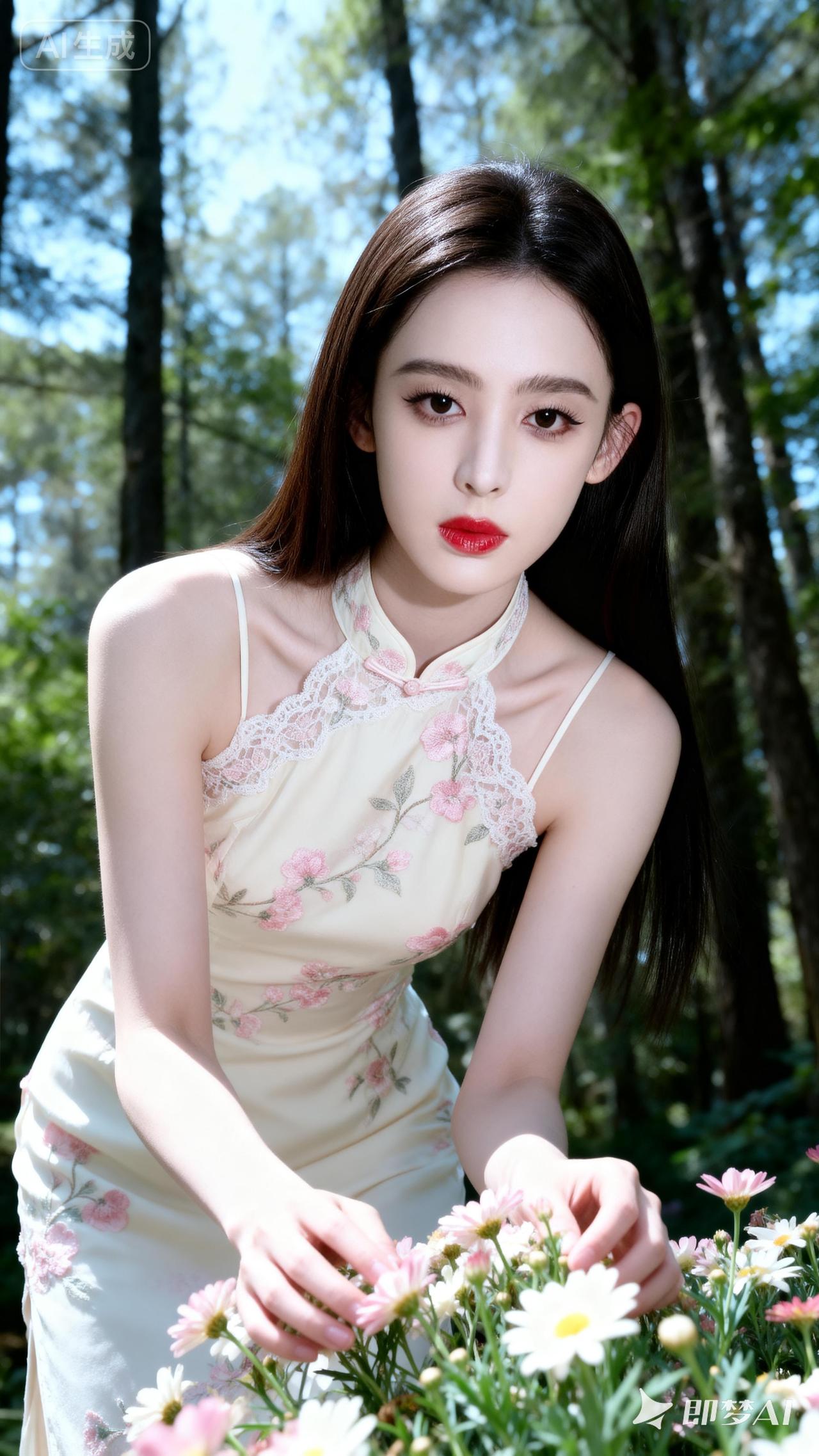 在森林中,她弯腰轻抚花朵,宛如仙子般优雅动人。