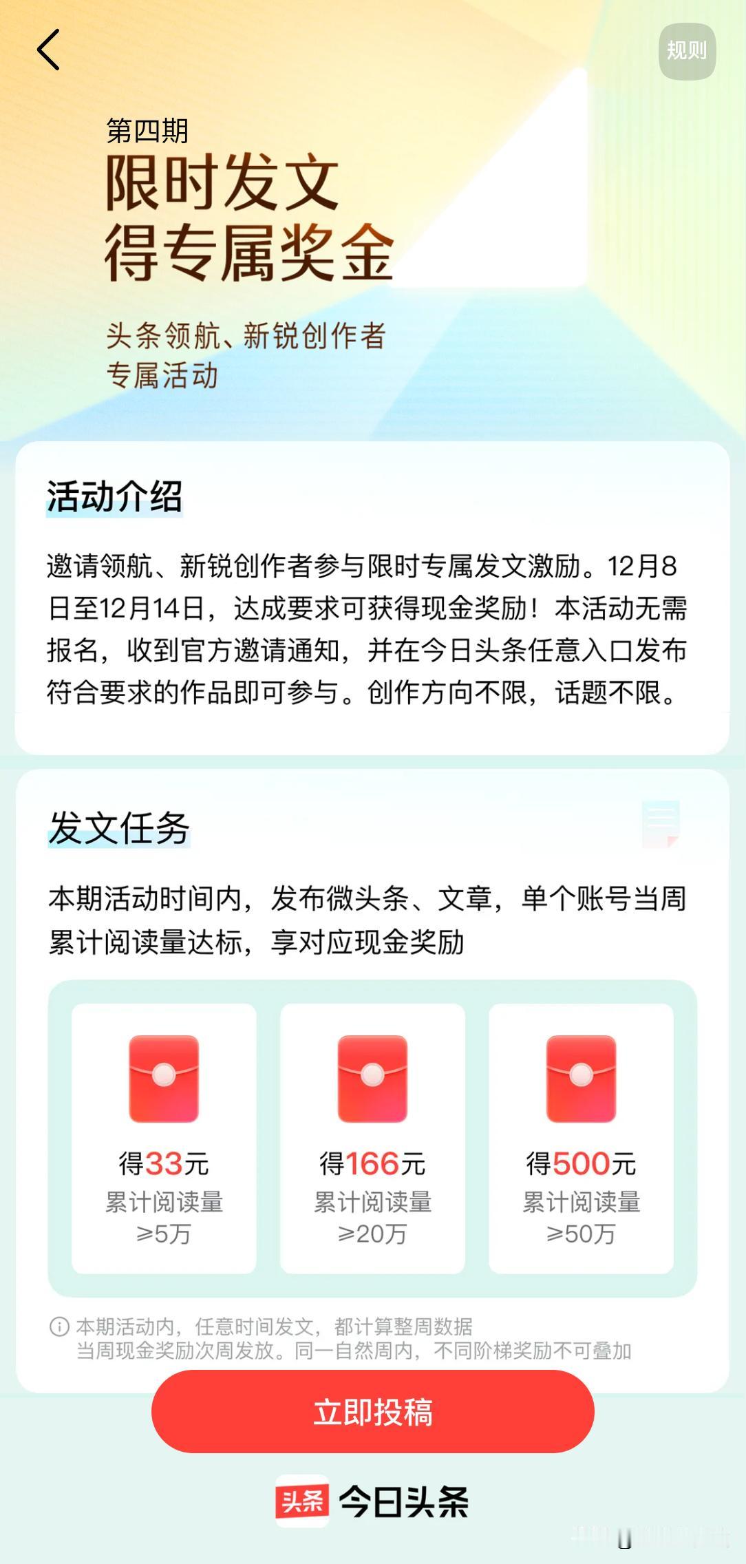“限时发文得专属奖金第四期”活动已经接近尾声了,参加活动的小伙伴们,你们的阅读量达标了吗? 本次活动,收到官方邀请通知,并在今日头条任意入口发布符合要求的作品即可参与。 对于创作方向和话题都不做限制,但需要注意的是此次活动对阅读量有硬性要求。 在“限时发文得专属奖金第四期”活动时间内(12月8日至12月14日), 所发布的微头条与文章,单个账号当周累计阅读量达标,享对应现金奖励: 1、累计阅读量≥5万得33元 2、累计阅读量≥20万得166元 3、累计阅读量≥50万得500元 到目前为止,活动已经接近尾声了,我的阅读量尚未达标,还差很多呢! 离活动结束时间只剩下两天的时间了,希望这两天能够出现一个奇迹——阅读量暴增! 时间紧迫啊!实在是没有办法了!迫在眉睫,卷又卷不动,躺又躺不平!自己好像也靠不住了,没有刚开始那样的雄心壮志,也没有鸡血可以打了,最后只能靠许愿了! 参加活动的小伙伴们!你们的阅读量达标了吗?你们也需要许愿吗? [笑哭][捂脸][泪奔][我想静静][抠鼻][捂脸][祝福][灵光一闪]