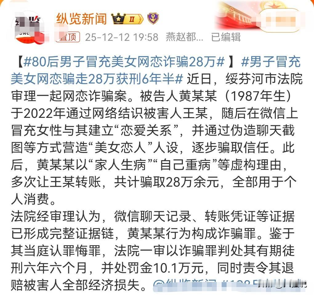 有些人实在是太好骗了吧。 12月12日看到这么个骗局。 80后男子冒充美女网恋诈骗28万。 只能说被骗的也是非常的大方,竟然这么舍得花钱。 面都没有见过,竟然就这么如此慷慨大方。 犯罪分子被判有期徒刑6年6个月。 也算是受到了惩罚。