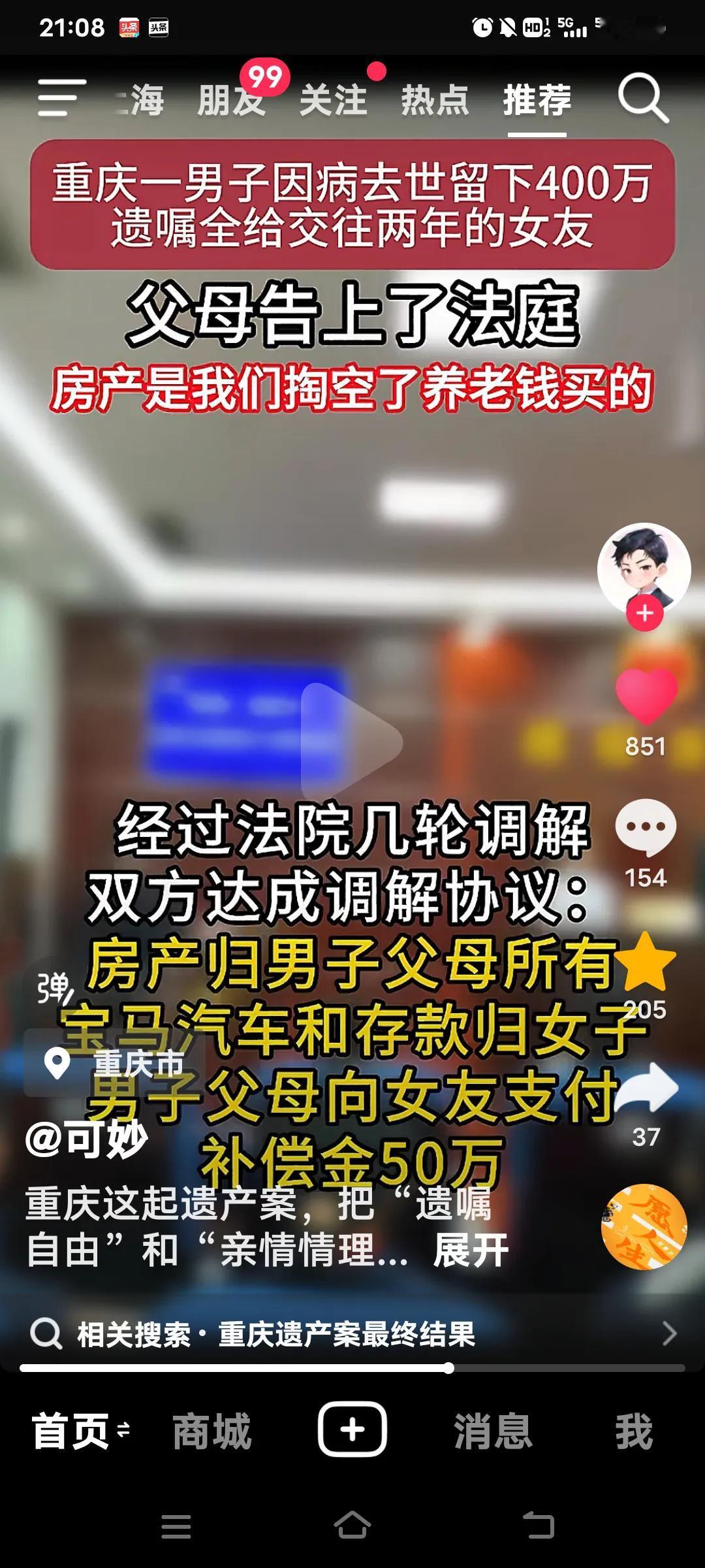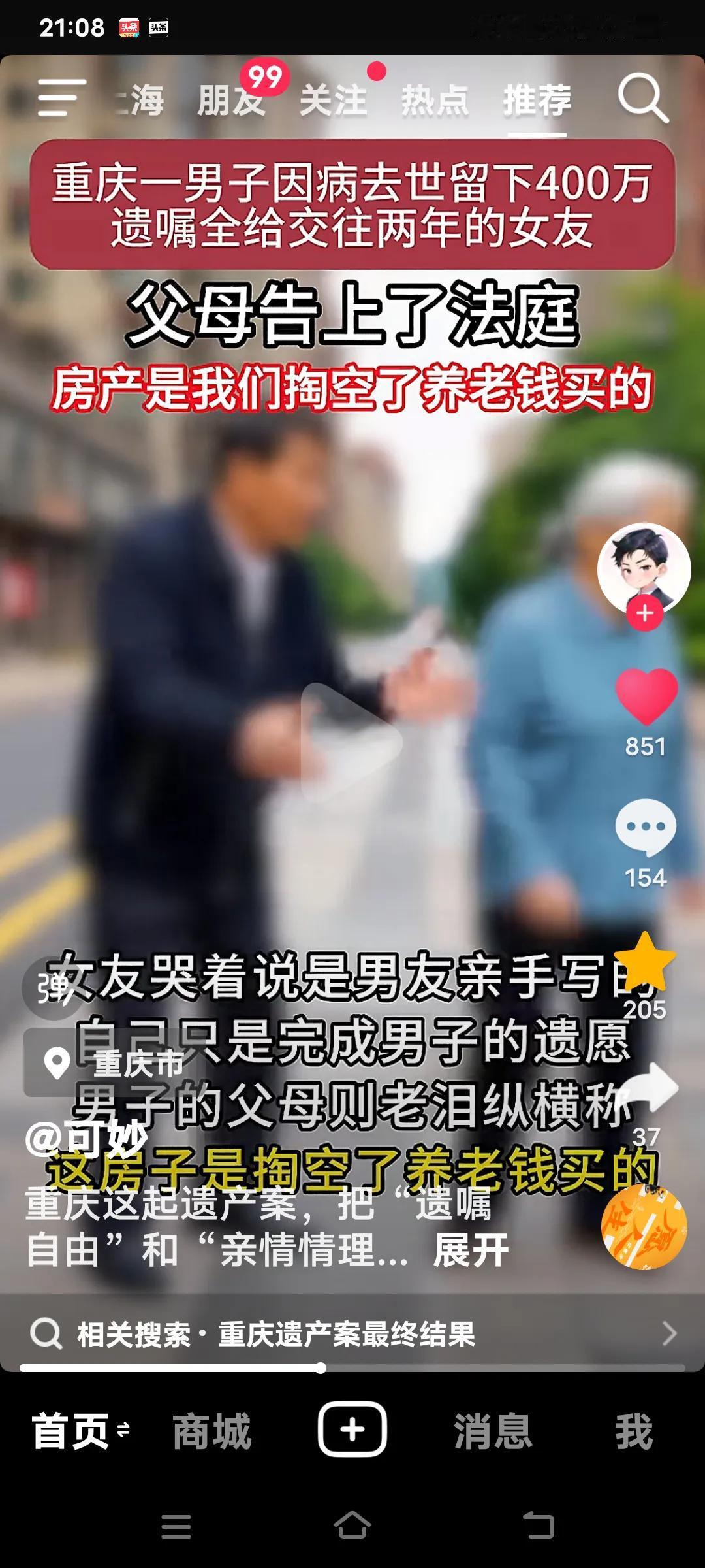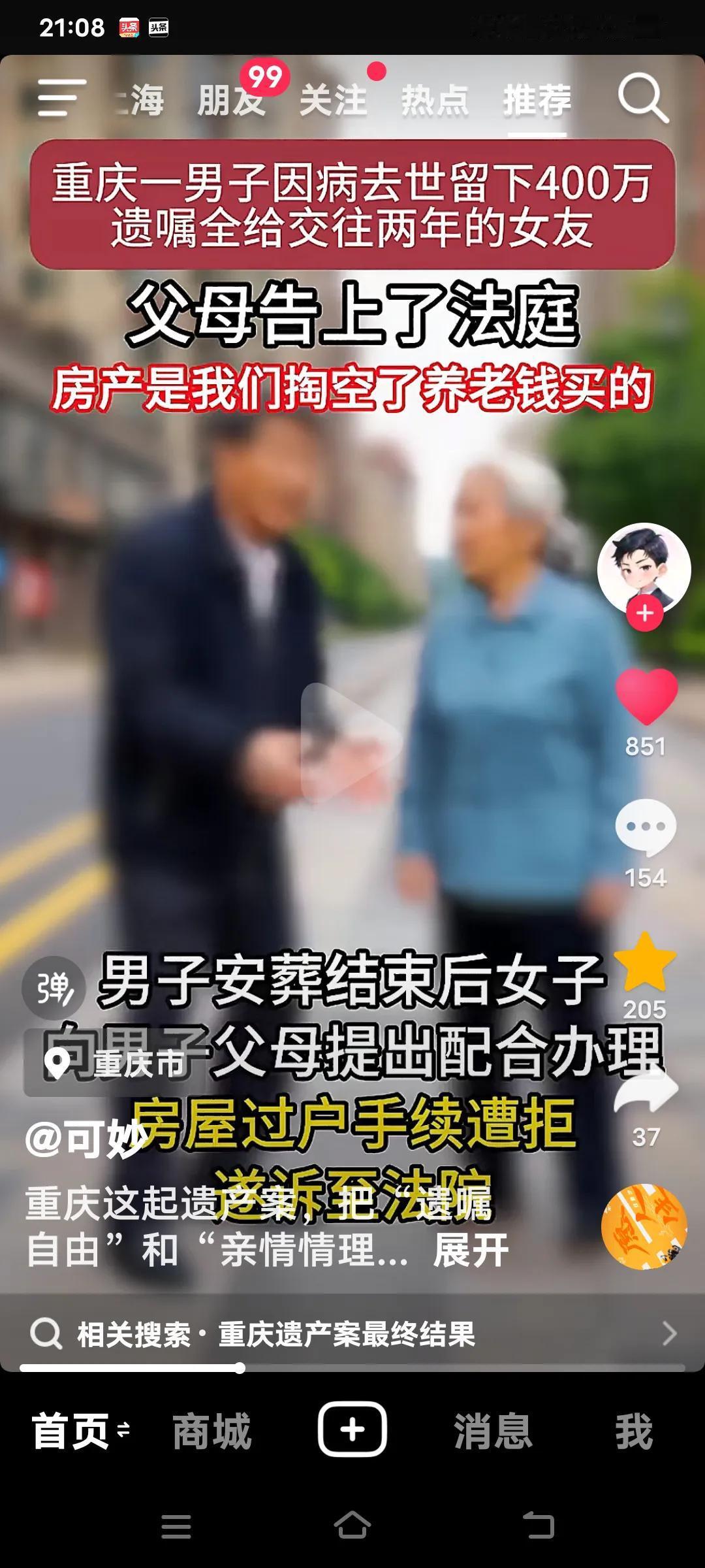 天下竟有这样的“好儿子”?重庆一男子因病离世,留下400万遗嘱,竟全部留给交往仅两年的女友! 毕竟没结婚,也没孩子。人走了,没给老人养老送终,怎么着也得为二老考虑考虑吧!女朋友迟早要嫁人,留部车也算仁至义尽了。怎能把房子和100万存款都留给女友呢! 这真是顾此失彼啊,不给女友留一分,显得他没良心;不给父母留一分,更没良心。老人可是拿出全部养老钱为他买的房子啊!走了还给二老添了麻烦! 二老无奈起诉至法院,与女友对簿公堂,经法院调解,才夺回房子,又拿出50万补偿女友。这事搞得,难道他上辈子欠了女友的不成?个人观点,不喜勿喷!遗嘱遗产 家庭立遗嘱 生前遗嘱 老人留有遗嘱 临终遗嘱