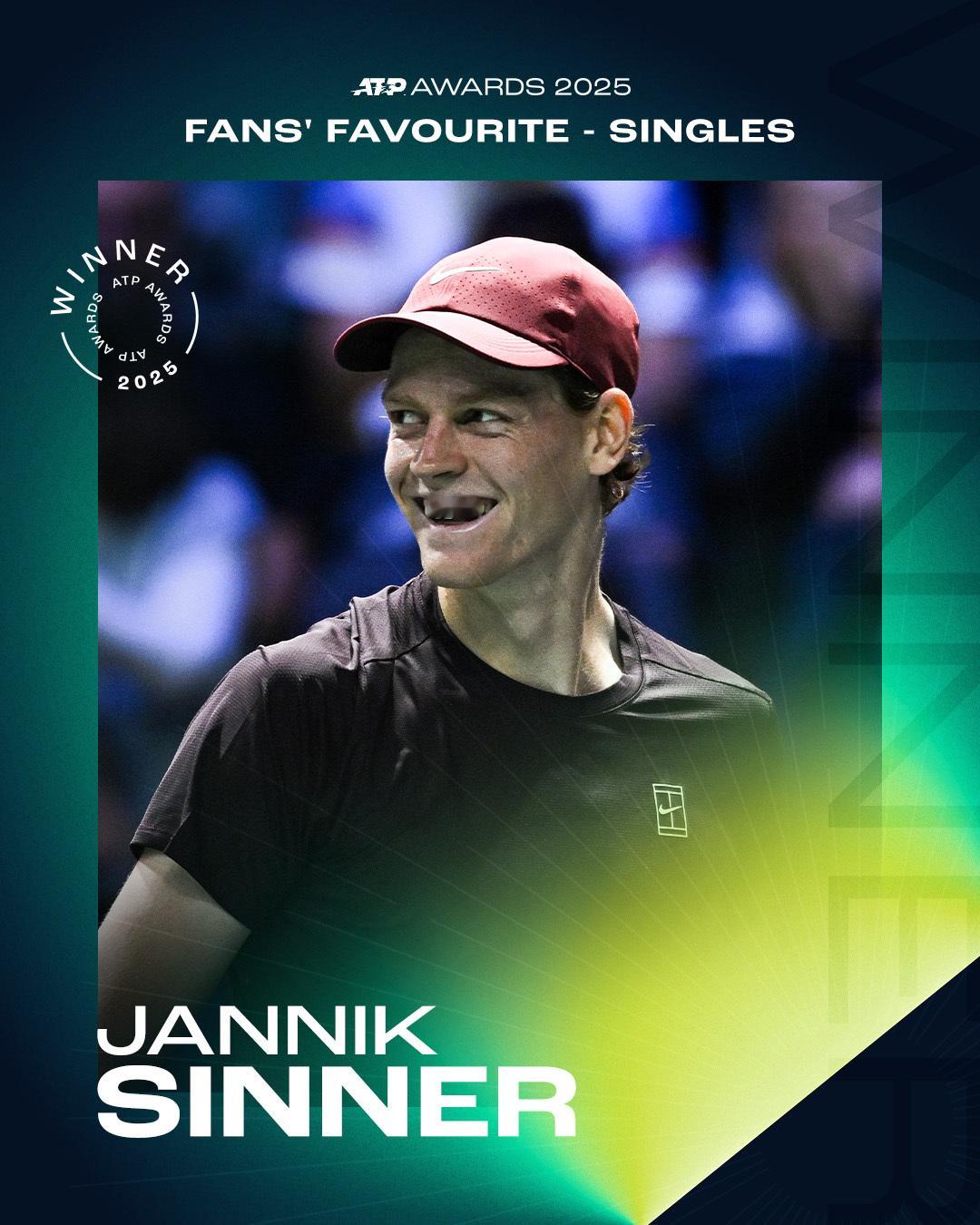今年ATP最受欢迎球员奖再次归属辛纳🇮🇹2023-2025:辛纳2022: