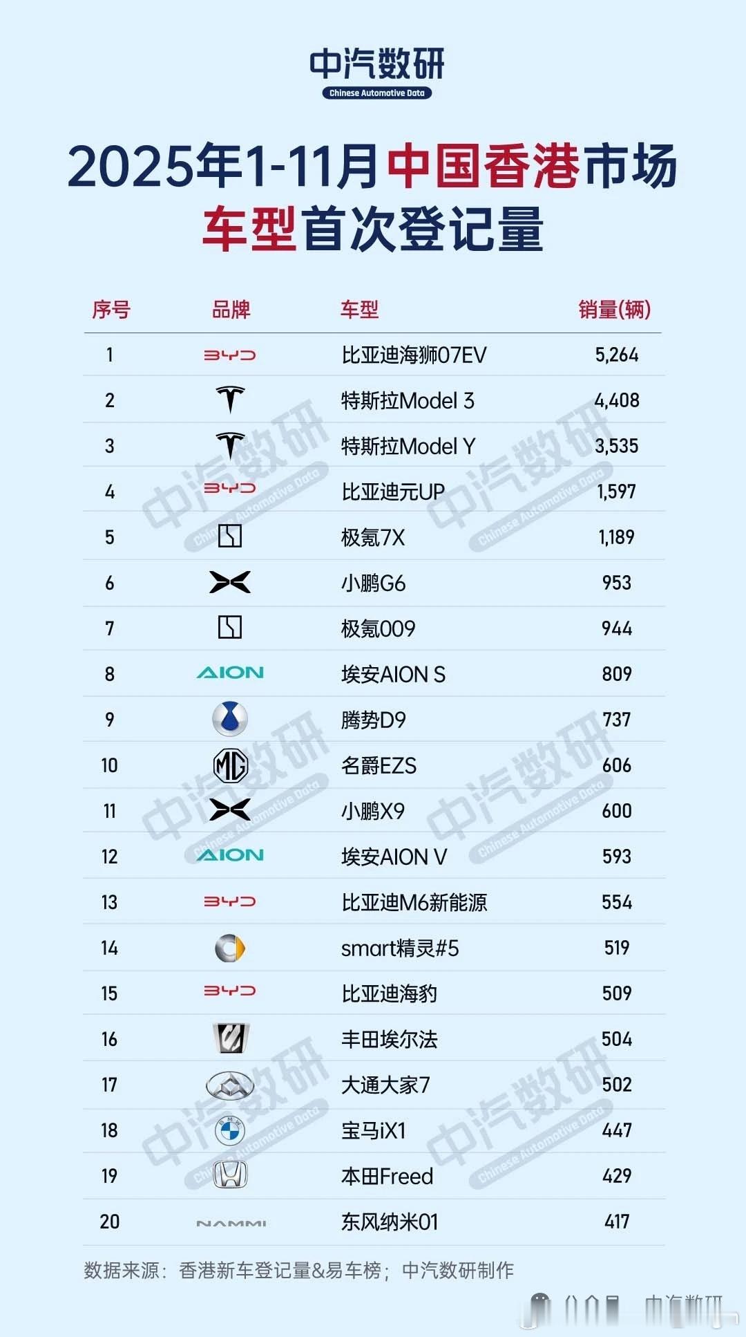 香港汽车市场 1~11 月品牌和车型销量,基本被国产品牌和车型霸榜了。丰田、本田,甚至日产出现在榜单里,我都不意外,但是斯巴鲁和铃木在列,确实比较意外。新能源汽车大V聊车新能源汽车