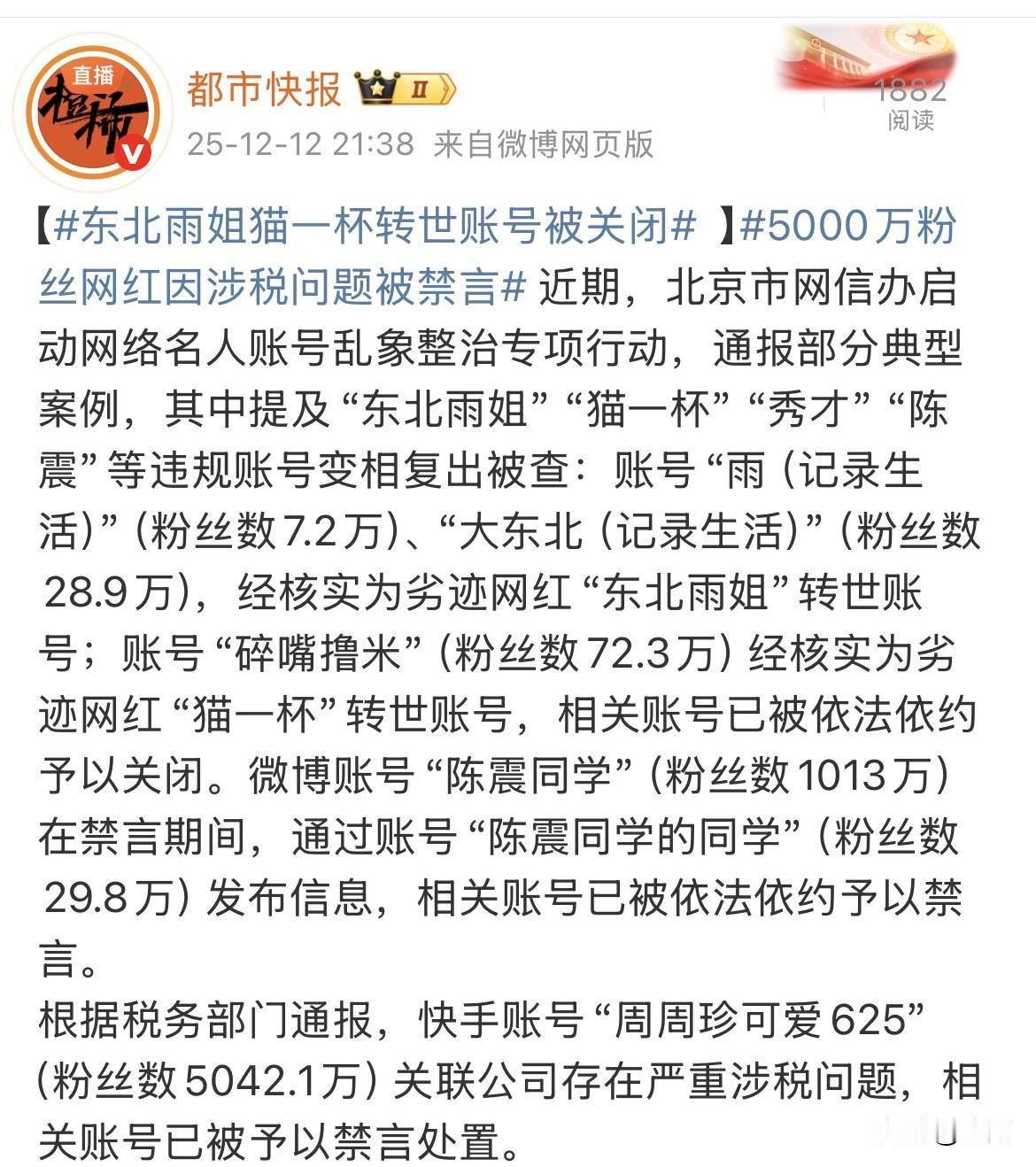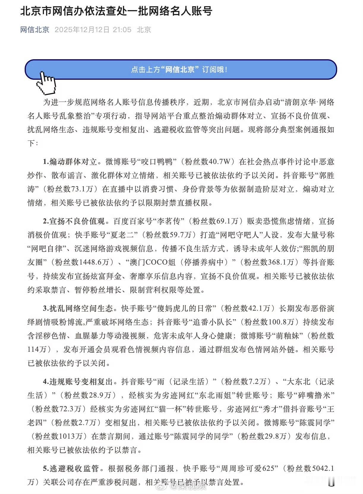 网信部门再点陈震,东北雨姐、猫一杯转世账号被关闭[捂脸] 今天晚上,北京市网信办在其官方社交账号,发布一起他们最新的通知。 这个通知一定分为五个大的点,详细的说明了,一些网络名人的号,为什么会被处置,以及他们相应的违规行为,都做了比较详细的讲解。 当然,拿了一些之前早期就被关闭的账号来举例子,这些人他们是很聪明的,账号被关闭这一段时间以来,他们想通过各种方式,继续在互联网复出[捂脸] 所以这一次也比较重点地介绍了,对这一部分人的处理态度和行为,也就是说这些人,在被处理的这段时间里面,依然换各种马甲,想用另外的方式或者身份,继续在互联网复出[捂脸] 所以这个通知在一定程度上是想告诉这些人 ,这条路现在走不通了,而且这些网络名人有的已经被处理一年多,甚至更长的时间,有的是刚刚被处理不久,有的粉丝量已经超过了5000万,可以说是真正的大网红。 不难看出,现在上面对这这些网络名人的行为规范,以及后续的处理,越来越规范了,也可以说是越来越严谨了。