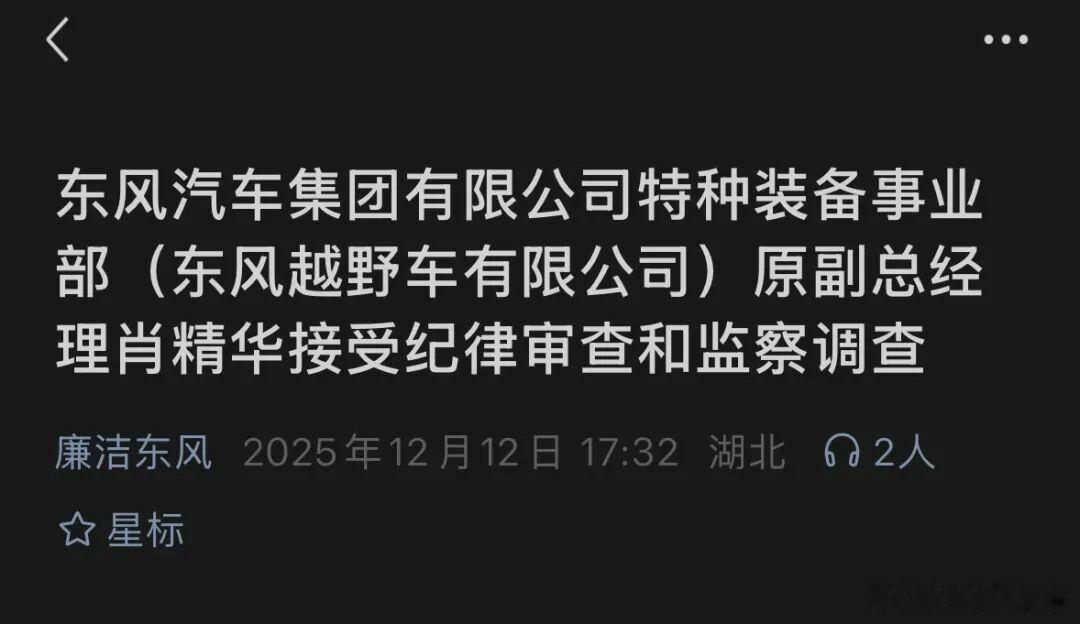 汽车民生 【肖精华被查!东风汽车反腐10年成效显著!】东风汽车集团有限公司特种装备事业部(东风越野车有限公司)原副总经理肖精华,涉嫌严重违纪违法,正接受纪委监委调查。肖精华此前主要负责特种装备业务,像军用越野车、出口维和装备这些敏感项目都归他管。官方没有说明具体是什么问题,但这个岗位本身就比较特殊,涉及军品生产,可能不仅仅是贪腐方面的事。具体涉案情况还是等官方通报为准,我们就不要瞎猜了。作为中国整车央企,东风公司是反腐最为积极的车企,大到集团,小到各子公司旗下部门,都有过管理人员被查的情况。据了解,自2025年以来,东风公司已经通报了12起反腐事件,平均每个月就有两名管理人员被查,这从侧面也印证了,东风公司内部腐败的严重性。东风汽车高压反腐可追溯至2015年,2019年后正式开启高压模式并持续深化,多年来在查处违纪违法人员、净化企业生态等方面取得了显著成绩:1. 反腐起点与强化节点:2015年11月时任东风公司总经理的朱福寿落马,且当月有55人接连被查,标志着东风汽车反腐风暴正式启动;2019年起其反腐力度全面升级为高压模式,后续多年始终保持这一整治态势,未出现力度松懈的情况。2. 查处规模与层级突破:截至2022年,公司纪委已立案551件、处分629人、留置75人。2023 - 2025年反腐成果更为密集,2023年至今仅公开通报被查的各级管理人员就超40人,2025年更是有肖精华、瞿浩等多名高管接连被查,其中不乏原副总经理童东城这样的正厅级高管,还有身为纪委书记的郑加坤这类纪检系统“内鬼”,实现了对从基层科员到高层领导的全层级覆盖。3. 覆盖多核心业务领域:反腐触角延伸至汽车产业链多个关键环节,东风雷诺、东风雪铁龙等合资车企成为整治重点,被查人员涉及研发、制造、销售、物流、资产管理等多个板块。例如东风公司原副总工程师方驰、东风锻造有限公司原总经理张兆德等,涵盖了技术核心岗与生产管理岗,有效遏制了各环节权力寻租现象。4. 完善机制与净化生态:2024年全年公布46起反腐事件,通过通报违反中央八项规定精神典型问题等方式警示全员;同时采用“驻在—属地”协同办案模式提升办案效能,其官方账号“廉洁东风”持续披露反腐进展,既形成强力震慑,也推动构建“不敢腐、不能腐、不想腐”长效机制,为企业高质量发展筑牢了根基。