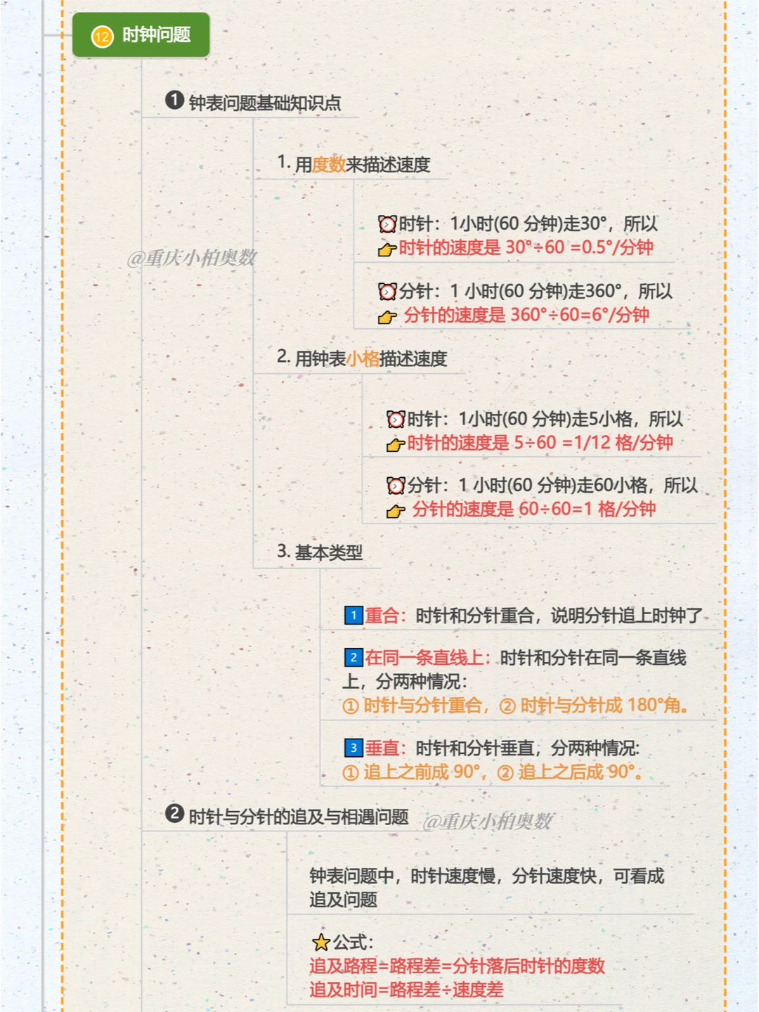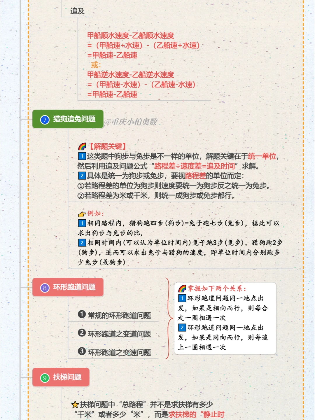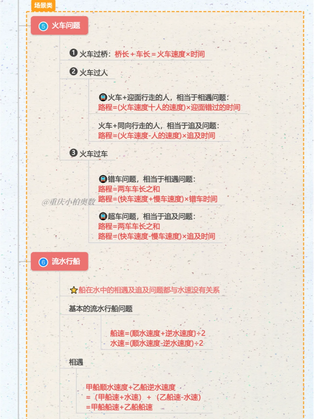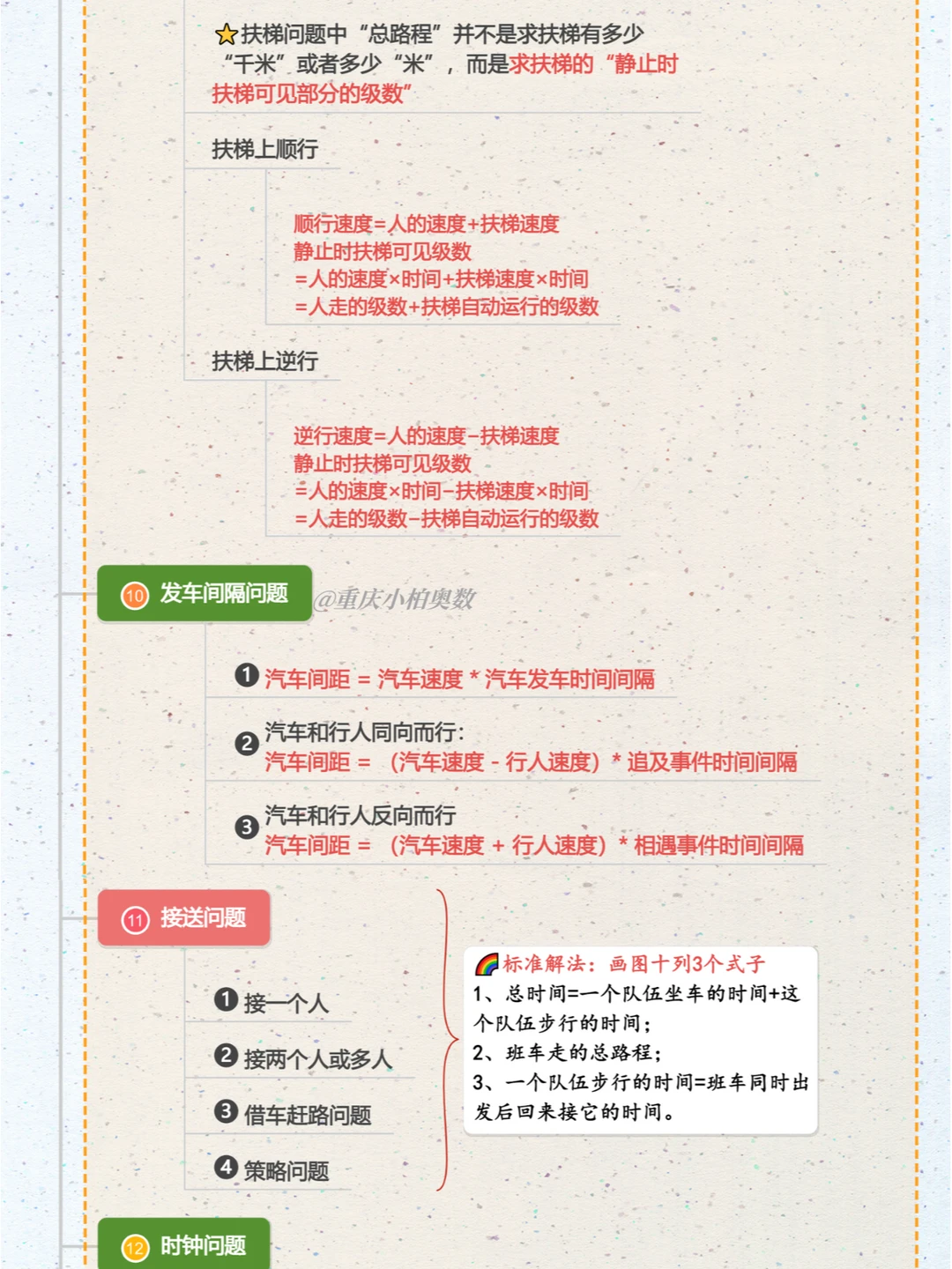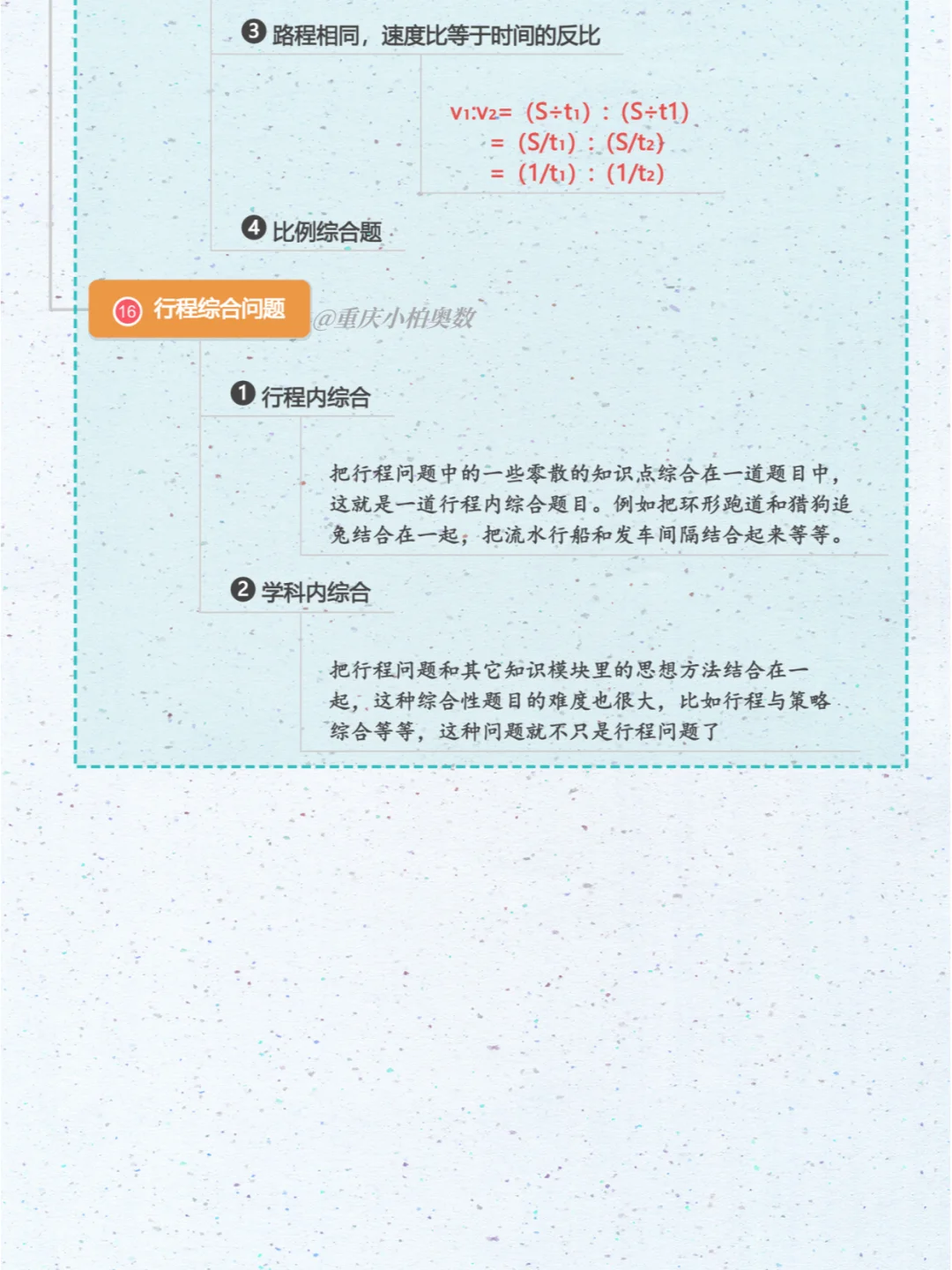 🌈小学奥数1-6年级行程板块16大题型➕公式汇总,真的汇总得太全面了✅ 💪💪行程问题本是应用题中的一类,但由于涵盖内容多、难度大,在进行小奥学习的时候,我们都会单独拎出来,做了一个板块进行学习,也是小奥4年级开始的重点和难点。这次梳理的16大题型分为三类: 1️⃣常见类:包含基础、进阶,也就是相遇追及问题与多人或多次相遇追及问题 2️⃣场景类:比如流水行船、火车问题、环形跑道问题、扶梯问题等等 3️⃣拔高类:属于综合类行程问题,较为复杂,比如变速问题。 📌【为什么行程板块难学❓】 1️⃣知识点众多:路程有直线、非直线和封闭型等多种类型,出发方式多样,时间上有同时、不同时出发等情况,速度有匀速和变速之分,对象有单人、双人和多人运动,还能进行排列组合。 2️⃣复合单位难理解:对于生活经验欠缺的孩子,速度这一复合单位较难,它融合了时间和路程,相当于平均数。 3️⃣学习曲线陡峭:知识点多且联系紧密,前面没听懂会影响后续学习,有些JG因课时有限,进度快,要么讲得浅导致娃儿做题困难,要么讲得又难又快导致上课听不懂。 4️⃣题干冗长:一道有难度的行程题,读明白过程需一分钟,中间变化和过程对比多,画图整理条件时可能无法完成或无从下手。 📌【如何学好行程板块呢❓】 1️⃣打好和差倍基础:分析行程问题的思路常用和差倍方法,比例思想也很重要,要熟练运用以缩短计算过程。 2️⃣深入理解路程=速度×时间:不要机械记忆公式,要思考其原理,明确公式的适用与不适用场景,通过画图如线段图、V-T 图、S-T 图等来体现,理解图中直线、面积的意义。 3️⃣理解相遇和追及的本质:拓展相遇和追及的应用场景,研究速度和与速度差,解决行程问题。 4️⃣画好图:固定画图风格,用什么颜色,什么线形,各个条件标在哪里要固化下来。 👉柳卡图本质是 S-T 图,不关心速度,只关心任一时刻物体的位置,这样就可以通过点线转化把运动轨迹拉开,运动情况就非常直观。