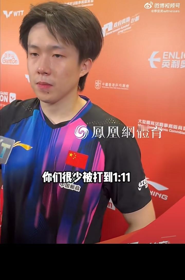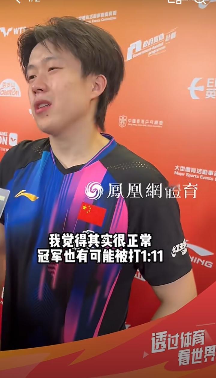 哈哈哈[捂脸], 王楚钦小嘴一张就是一个小节目[赞]! 今晚香港总决赛混双小组循环赛第一组第三轮比赛中,莎头组合🇨🇳在第四局1-11不敌港队黄镇廷/杜凯琹🇭🇰组合(当然最终还是莎头组合赢了)。 木成色的记者采访时对王楚钦发问:你们很少被打成1-11的…… 然而机智的王楚钦直言:“我觉得很正常,冠军也有可能被打到1-11,也不是一局定胜负”[捂脸][捂脸]。 确实,对手发挥出色很正常,但我们的莎头超级超级棒,对手发挥这么好的情况下,他们依然能赢,只能说明莎头实力更强[赞]! 对手发挥再精彩,我们依旧是我们![奋斗][赞]