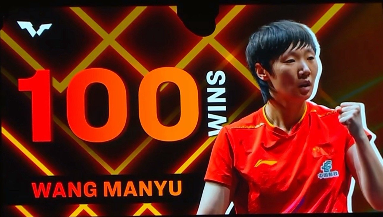 WTT香港总决赛女单1/4决赛中,王曼昱4-1战胜韩国选手朱芊曦,晋级女单4强的同时解锁了个人WTT单打生涯的第100场胜利。半决赛中,王曼昱将对阵首次参加总决赛的队友陈熠。