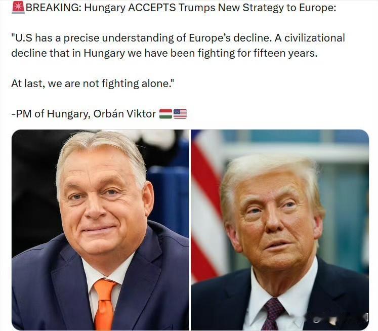 匈牙利接受了特朗普对欧洲的新战略: “美国对欧洲的衰落有着精准的认识——这是文明层面的衰落,而在匈牙利,我们已经为此奋斗了十五年。 终于,我们不再孤军奋战。” ——匈牙利总理维克多·欧尔班