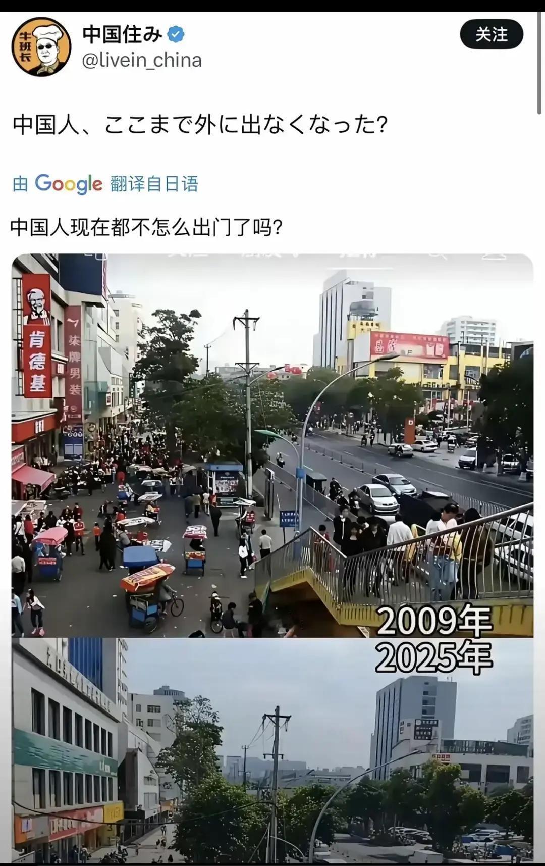 果不其然。 日本网友突然抛出了一个疑问:中国人现在都不出门了吗? 这两天一张 2009 年和 2025 年的中国街景对比照在 X 平台刷屏,直呼 “同一地点人少了”,还纠结是 “经济走弱” 还是 “生活方式换赛道”。 其实答案特简单:不是中国人不出门了,是咱们的生活方式早就升级换代,消费和社交的场景从 “挤大街” 搬到了 “线上 + 精准线下”,日本网友还停留在 “人多 = 经济好” 的老观念里,这波属实是没跟上中国的发展节奏! 先把这事的核心说透:街景人少不代表经济不行,恰恰是中国数字化发展和消费升级的必然结果。2009 年的时候,网购还没普及,外卖刚起步,大家买东西、吃饭、社交都得往商业街、商场跑,街上自然人山人海。 可到了 2025 年,情况早就变了 —— 线上购物占比已经冲到 58%,比线下还高,综合电商、短视频带货、社区团购把购物渠道搬到了手机里,不用出门就能买遍全球,谁还愿意顶着太阳挤公交去逛街? 艾媒咨询的数据显示,现在 57% 的中国人都是 “线上线下结合” 购物,买菜靠社区团购,买衣服先线上比价,真要逛街也是奔着体验去的,不是单纯为了买东西,街上自然少了以前那种摩肩接踵的热闹劲儿。 关键,生活服务也全被数字化重构了。以前想吃饭得去餐馆排队,现在抖音直播领个优惠券,线上预约到店直接核销,或者干脆点外卖送到家,省时又省力;想旅游不用先去旅行社,刷短视频看达人探店,直接线上订机票、订民宿,到地方直奔景点;就连家政、维修这些事儿,手机上点几下就能预约上门,压根不用出门瞎转悠。 而日本网友觉得 “人少 = 经济差”,说白了是没见过这种 “数字化生活” 的阵仗。 他们自己的新宿 ALTA 百货闭店,秋叶原电器街没了往日热闹,就以为中国也一样是经济不行,却不知道人家是传统商业模式没跟上时代,而中国是主动升级了生活方式。 就像日本的优衣库、无印良品,现在也在学中国搞 “线下展示 + 线上会员”,因为他们发现年轻人都习惯 “线上比价、线下试穿、直播间下单”,纯线下门店根本留不住人。 中国早就走完了这个转型,街上少的是盲目逛街的人,多的是精准消费、线上互动的人,这哪里是经济走弱,分明是经济质量变高了。 还有个容易被忽略的点:城市发展让消费场景更分散了。2009 年的时候,一个城市就那么几个核心商圈,大家都往一个地方挤;现在每个社区都有超市、便利店、小型商业中心,楼下就能满足日常需求,没必要再扎堆去市中心。 加上地铁、网约车普及,出行更便捷,大家的活动范围分散了,单个地段的人流量自然不如以前集中。就像北京的王府井、上海的南京路,现在更多是游客打卡的地方,本地人购物、消费早就不依赖这些核心商圈了,街景看着人少,其实是城市功能更完善了,不是经济不行。 反观日本,他们的电商渗透率比中国低,生活服务数字化也没这么普及,大家还是习惯出门购物、消费,所以看到中国街景人少就觉得奇怪。 可他们忘了,自己的传统商圈也在面临同样的问题,少子老龄化让家庭消费衰退,便利店和小型社区商业崛起,大型商场的客源也被分流了,这是全球城市化和数字化发展的必然趋势,不是中国独有的现象。 只不过中国转型得更快、更彻底,让日本网友一时没反应过来。 可能有人会说,那有些地方街景确实冷清,是不是实体经济不行了?其实是实体经济在 “优胜劣汰”。 2025 年上半年有 1.7 万家实体店倒闭,但那些数字化转型的门店营收反而增长 40%,客流提升 35%,会员复购率是普通门店的 3.5 倍。这说明不是实体经济不行了,是 “不会转型的实体经济” 不行了。 以前那种靠人流量赚钱的路边小店,不搞线上引流、不做特色服务,自然会被淘汰;而那些抓住数字化机遇的商家,靠线上种草、线下体验,活得比以前更滋润。 这里面的门道其实很简单:日本网友的疑问,本质上是用旧眼光看新事物。中国人不是不出门了,是出门的目的变了,消费的方式变了,生活的节奏变了。街景人少不代表经济衰退,恰恰是数字化发展、消费升级、城市进步的体现。就像以前大家都用现金,现在没人带钱包了,你能说现金少了就是经济不行吗?显然不能。 说到底,日本网友还是得好好补补 “中国常识”,别再用 “人多不多” 来判断经济好不好。中国的发展早就超出了 “看表面热闹” 的阶段,追求的是更便捷、更高效、更个性化的生活方式。 街景虽然少了人山人海,但手机里的消费热情、线上线下的融合活力,才是中国经济真正的底气。那些还在纠结 “中国人为啥不出门” 的人,不妨下载个中国的购物 APP、生活服务 APP,体验一下数字化生活,就知道不是我们不出门,是我们的生活已经 “进化” 到不用出门也能精彩无限了!