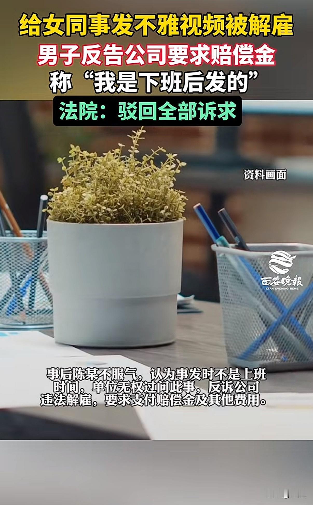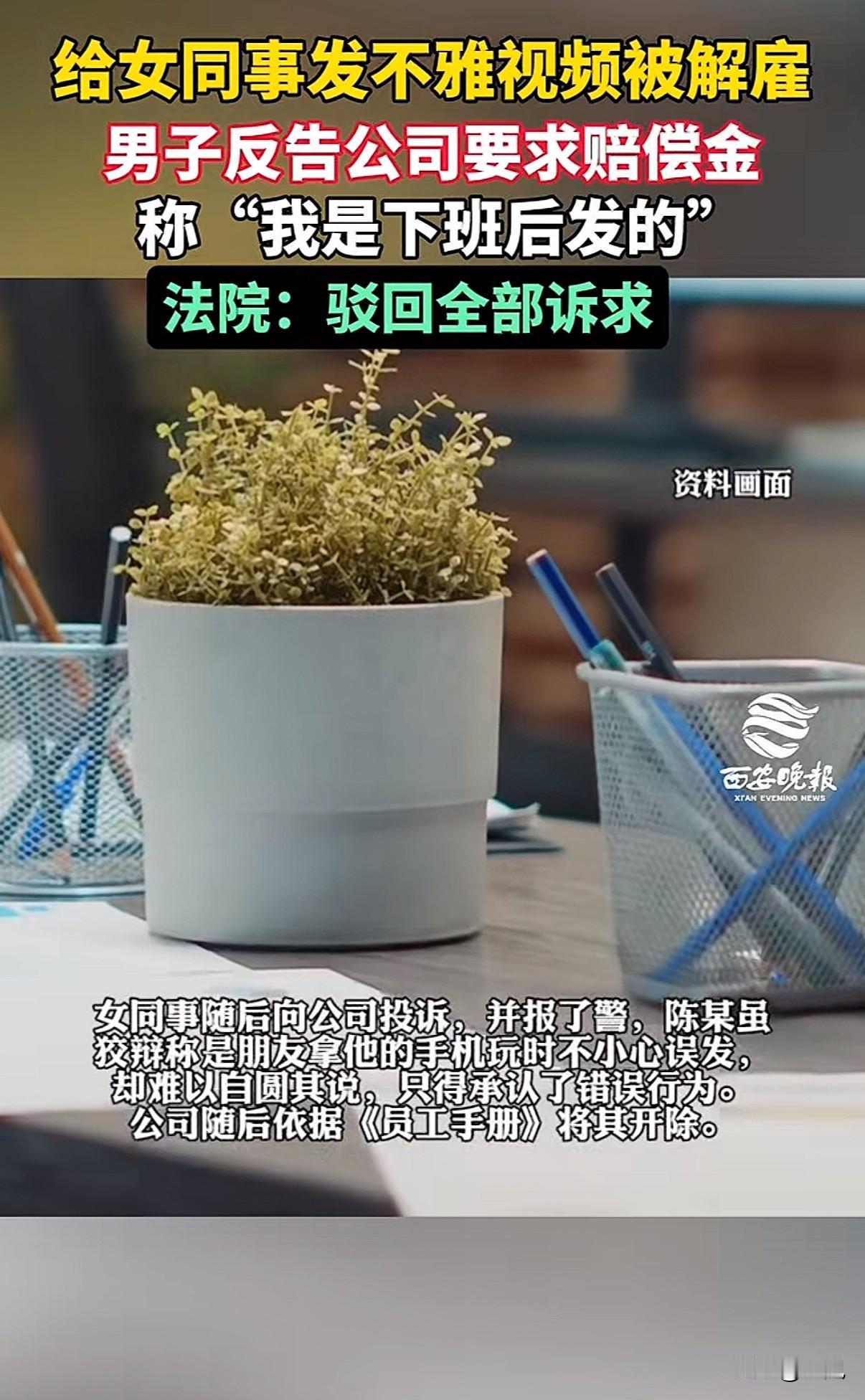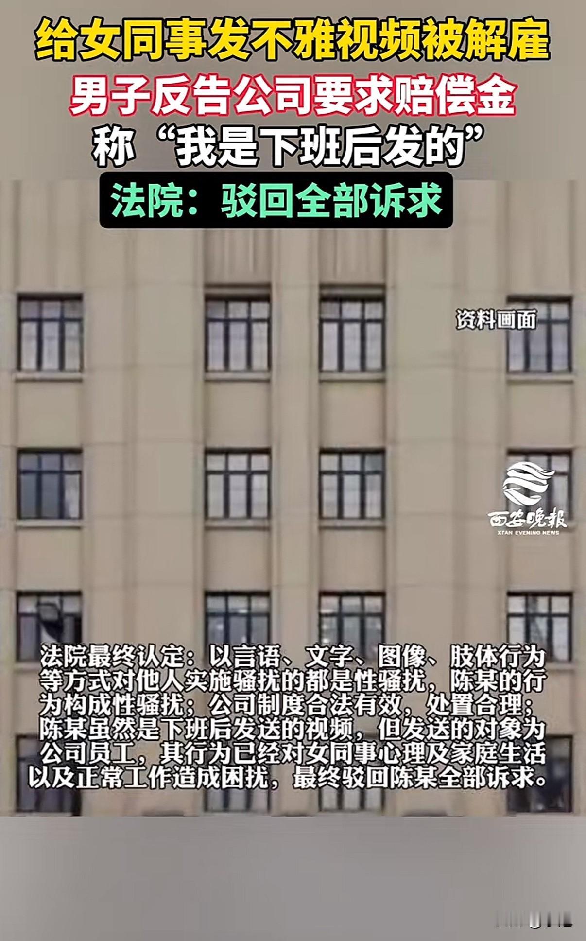 这事可太典型了。一男的,晚上给女同事发不雅视频,女同事老公看见,家里闹翻天,直接报了警。公司二话不说把他开了。他不服,说“又不是上班时间发的”,反手把公司告了,要赔偿。结果呢?法院驳得干干净净,一分没要到。 来龙去脉是这样的。陈某晚上用微信,给一位已婚的女同事发了段不雅视频。女同事那边,可能是手机没锁屏,被她老公看到了。这下可好,家里炸了锅,夫妻俩大吵一架。女同事又气又委屈,转头就向公司投诉,紧接着去派出所报了警。 事情闹大了,陈某开始慌了。他一开始跟公司狡辩,说不是自己发的,是“朋友拿我手机玩,不小心误发了”。这话听着就站不住脚。警察一问,细节对不上,漏洞百出。眼看圆不过去,他只好认了,还白纸黑字写了份保证书,承认自己做了错事。 公司这边,也不是随便开的他。公司有《员工手册》,里面清清楚楚写着禁止性骚扰等条款,而且这手册是经过合法程序制定、向员工公示过的,陈某自己也参加过培训。公司认为,他的行为严重违反了规章制度,属于“严重违纪”,依据《劳动合同法》第三十九条,可以解除劳动合同,而且不用给补偿。于是,一纸通知,把他开除了。 陈某越想越憋屈,觉得公司管得太宽。他坚持认为,发视频是下班后的私人时间、私人行为,跟工作无关,公司没权力因为这个开除他。于是,他去法院起诉,说公司违法解雇,要求支付赔偿金。 法院的判决,把道理讲得很透。 第一,这行为就是性骚扰。法律规定了,性骚扰不光是动手动脚,发文字、发图片、发视频,都算。关键是,这个行为是不是让人感到冒犯、厌恶,造成了心理压力。陈某发不雅视频给女同事,直接导致对方家庭失和、心理受创,还闹到报警,这已经严重干扰了女同事的正常生活和精神状态,构成性骚扰没跑。 第二,公司开除他,合法合理。公司的规章制度合法有效,陈某也知晓。他的行为,白纸黑字地违反了制度里最严重的禁令之一。公司依规处理,程序上挑不出毛病。 第三,也是最关键的一点:不是“下班了就管不着”。法院认为,劳动关系具有延续性,员工的行为如果严重影响了其他同事的权益,破坏了公司正常的职场环境和秩序,哪怕发生在下班后、公司外,公司也有权进行管理。他骚扰的对象是同事,后果直接波及了职场关系,公司当然能管。 这件事,看着是个案,其实背后有两个点,挺值得琢磨。 一是侥幸心理要不得。陈某可能觉得,下班后“玩一玩”,神不知鬼不觉。他没料到对方老公会看到,更没想到会闹到报警、公司介入。很多错事,都是从“觉得不会被发现”开始的。 二是界限感很重要。同事关系有它的边界,什么能聊,什么不能传,心里得有数。把同事当成可以随意发送私密、不良信息的对象,本身就是一种越界和冒犯。这种越界,不仅伤害别人,最终也反噬了自己。 法院的判决,给了一个清晰的信号:无论在不在工位上,尊重他人,恪守底线,都是一个职场人该有的基本素养。越了线,就要承担后果。公司依据合法制度清理门户,法律是支持的。 这事,说到底就是自己作了,还怪公司管得严,法律没给他这机会。