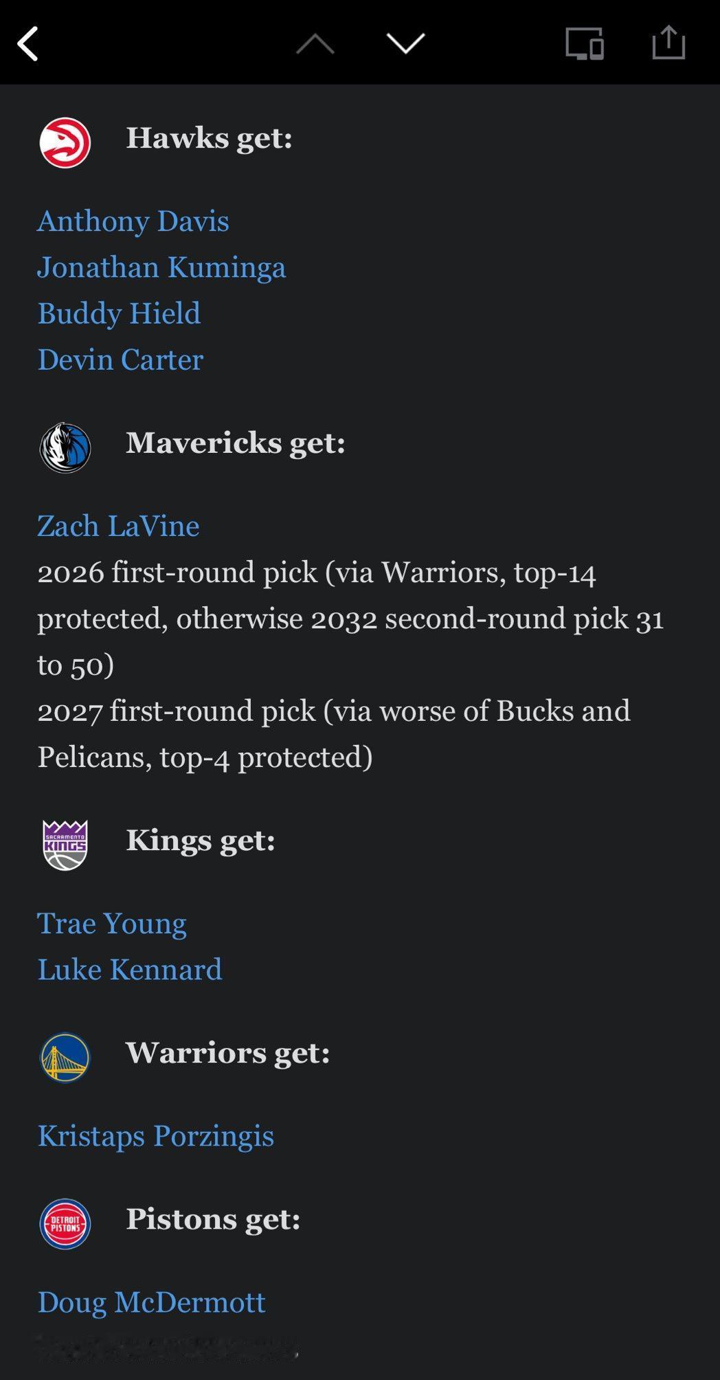 别再盯着零敲碎打的交易流言了。 真正的地震级操作,是直接把五支球队的棋盘掀翻。 勇士在用库明加和选秀权,拼命撬动凯尔特人的波神。 一个场均20+7、拉开空间的巨塔,听起来很美。 但追梦格林站在弧顶发牌时,波神是蹲在底角,还是挤在禁区? 科尔要解的是一道无解的兼容性难题。 真正的风暴眼在亚特兰大。 老鹰敢同时送走杨和波神,吞下安东尼·戴维斯。 他们得到的不是一个超巨,而是一个健康出勤率创湖人生涯新高的“全力眉”。 代价是,后场直接真空。 这笔交易不是在补强,是在赌博重建的基石。 独行侠的动作最令人费解。 用健康的浓眉,去换一个刚崴了脚的扎克·拉文,再加两个未来的首轮签。 东契奇已经持球在手,再来一个需要球权才能起舞的得分后卫? 库班的算盘,或许是“用当下的不确定,赌未来两张彩票”。 但球迷的耐心,从来不是彩票。 国王得到了他们梦寐以求的持球核心——特雷·杨。 代价是送走年轻的卡特和拉文。 杨和小萨博尼斯的挡拆,将是进攻万花筒,也是防守端的提款机。 他们赌的是:用华丽的进攻,掩盖千疮百孔的防守。 活塞悄无声息地收下射手和现金,他们是这场乱局里,唯一清醒的旁观者和获利者。 当你以为球队只是在修修补补,顶层操盘手们,已经在重构整个联盟的权力图谱。 这不是交易,这是一次权力的迭代与转移。