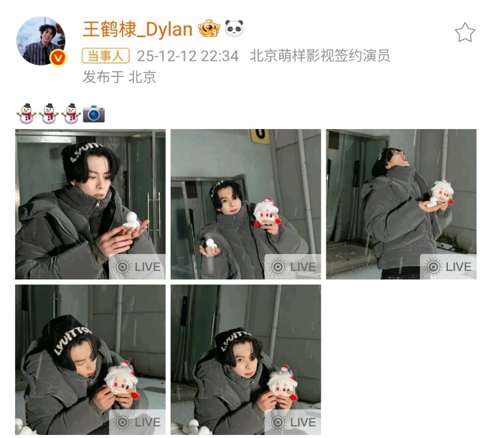 王鹤棣初雪晒照王鹤棣堆的小雪人 王鹤棣初雪晒五宫格照,好mini的小雪人 ,雪人可爱,人也可爱