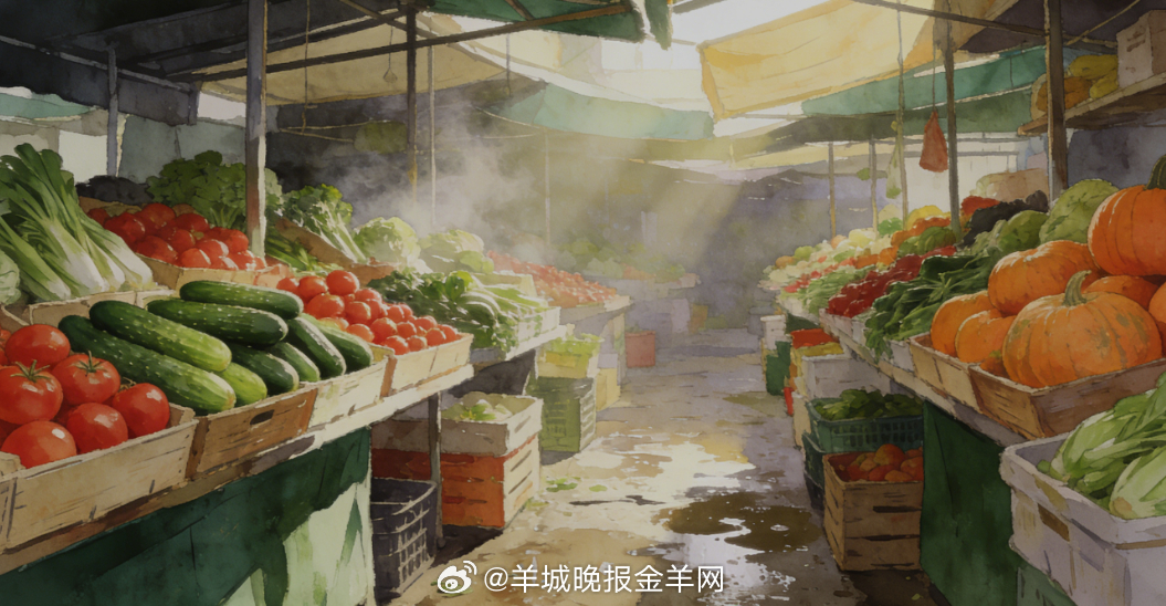 早安 清晨的菜市场,摊位上摆满了新鲜的蔬菜水果,有红色的番茄、绿色的黄瓜、橙色的南瓜等,地面有些许水渍,阳光透过顶棚的缝隙洒下,空气中弥漫着蔬菜的清香,早安~今天的早餐吃些什么呢?