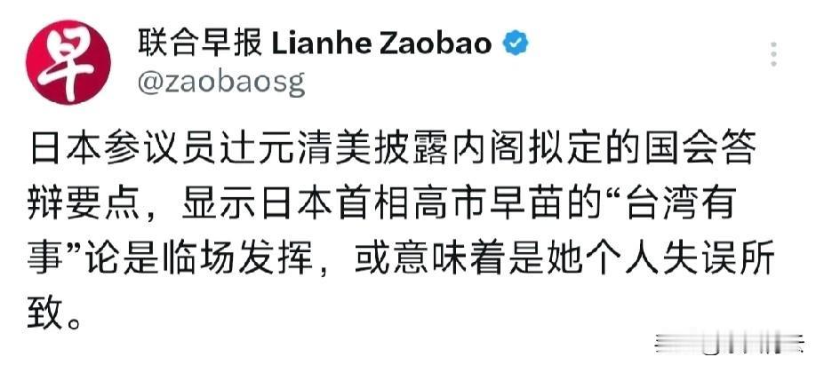 日本这波操作把“避重就轻”玩到极致!新加坡联合早报披露,日本参议员爆出高市早苗“台湾有事”论是“临场发挥、个人失误”,摆明了想把严重挑衅说成无心之失,这甩锅套路也太敷衍了! 明眼人都能看穿,高市早苗作为日本首相,一言一行都代表官方立场,哪有什么“临场失误”的可能? 说白了就是先放狠话试探中方底线,见中方强势反击、中日关系紧绷,又赶紧找借口卸责,既想打“台湾牌”蹭热度、讨好美国,又不想承担破坏地区稳定的后果,算盘打得隔着屏幕都能听见。 近期日方频频“送台阶”,却始终没拿出半点诚恳态度,所谓“个人失误”不过是逃避责任的挡箭牌。 台湾问题纯属中国内政,轮不到任何外部势力指手画脚,高市早苗的错误言论早已伤害中国人民感情、触碰中方核心利益,岂是一句“失误”就能翻篇的? 中方绝不会接受这种毫无诚意的说辞,日本要是真有维护中日关系的心思,就该深刻反思自身行为,公开撤回错误言论、拿出实际整改行动,别再搞这些虚头巴脑的套路,否则只会让两国关系越走越僵,最终自食恶果!