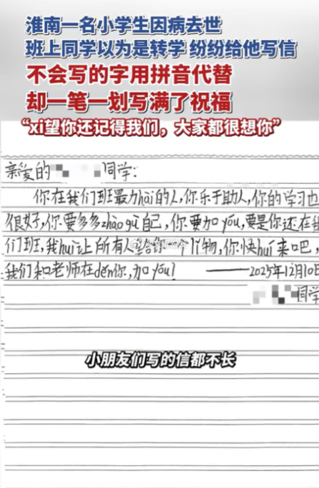 小学生病逝同学以为是转学纷纷写信 纸短情长,童真如诗安徽淮南一位三年级学生因病离世,班主任用“转学”的善意谎言守护了孩子们的童年。班里的学生纷纷写信给“转学”的同学,用拼音和稚嫩笔迹写下“大家都很想你”,还有人送上自己最珍爱的橡皮和卡片。班主任将信件、礼物与逝去学生的书本一起珍藏,并放入一朵手折红花。她自一年级带班至今,悲痛之余选择以温柔的方式延续纯真。网友感动评论:“拼音拼出的是最干净的深情。”这些歪扭的字迹里,藏着一个班级未说出口的告别,也照亮了人性中最柔软的光,原来善意的谎言,也能让思念长成温暖的形状。xi望你还记得我们得知小学生因病去世班主任哭了好久