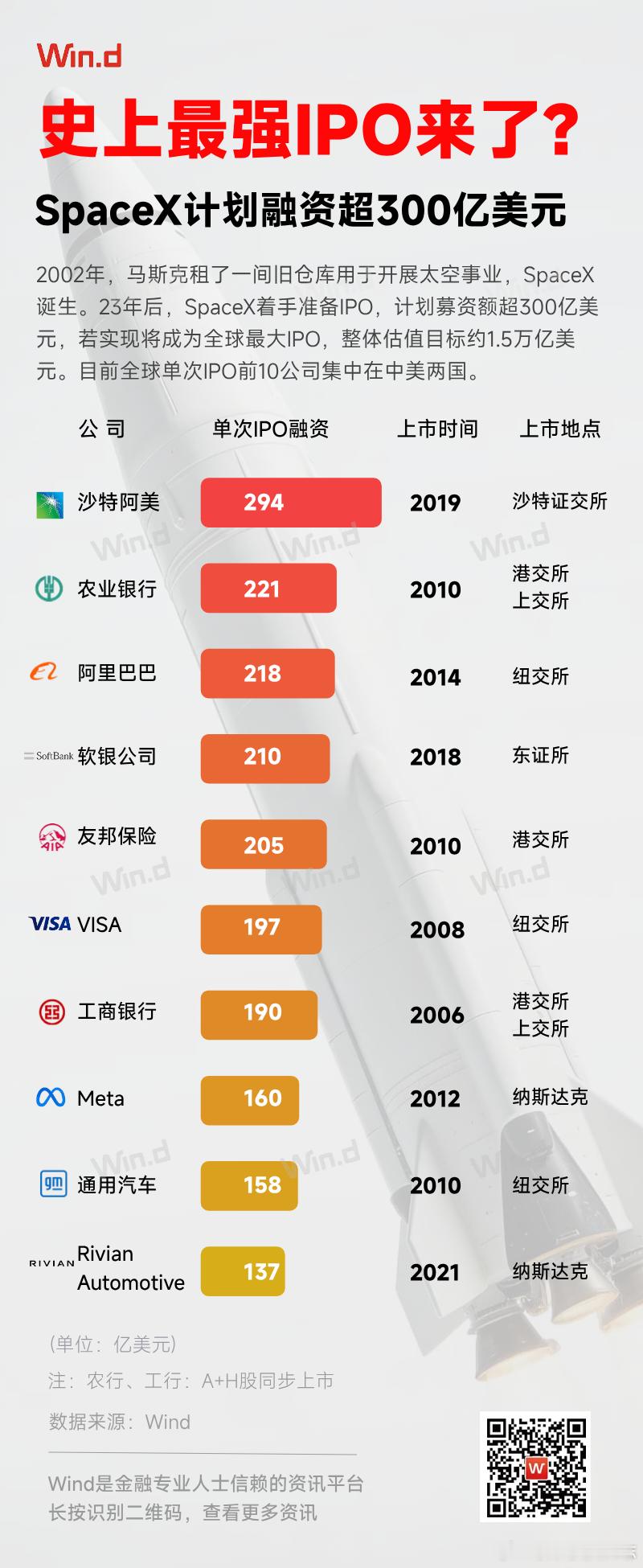 价值投资日志 【万得图说】史上最强IPO来了?SpaceX计划融资超300亿美元2002年,马斯克租了一间旧仓库用于开展太空事业,SpaceX诞生。23年后,SpaceX着手准备IPO,计划募资额超300亿美元,若实现将成为全球最大IPO,整体估值目标约1.5万亿美元。目前全球单次IPO前10公司集中在中美两国。