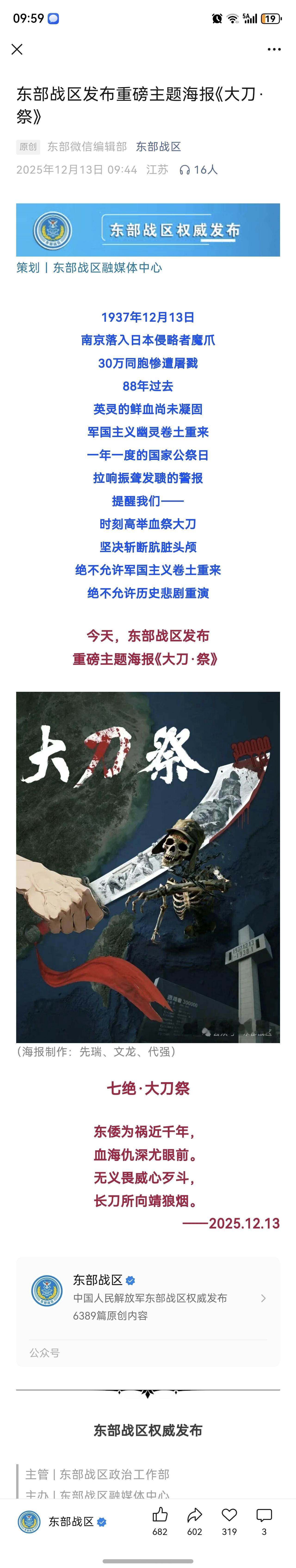 东部战区发布重磅主题海报《大刀·祭》 七绝·大刀祭 东倭为祸近千年, 血海仇深尤眼前。 无义畏威心歹斗, 长刀所向靖狼烟。 ——2025.12.13