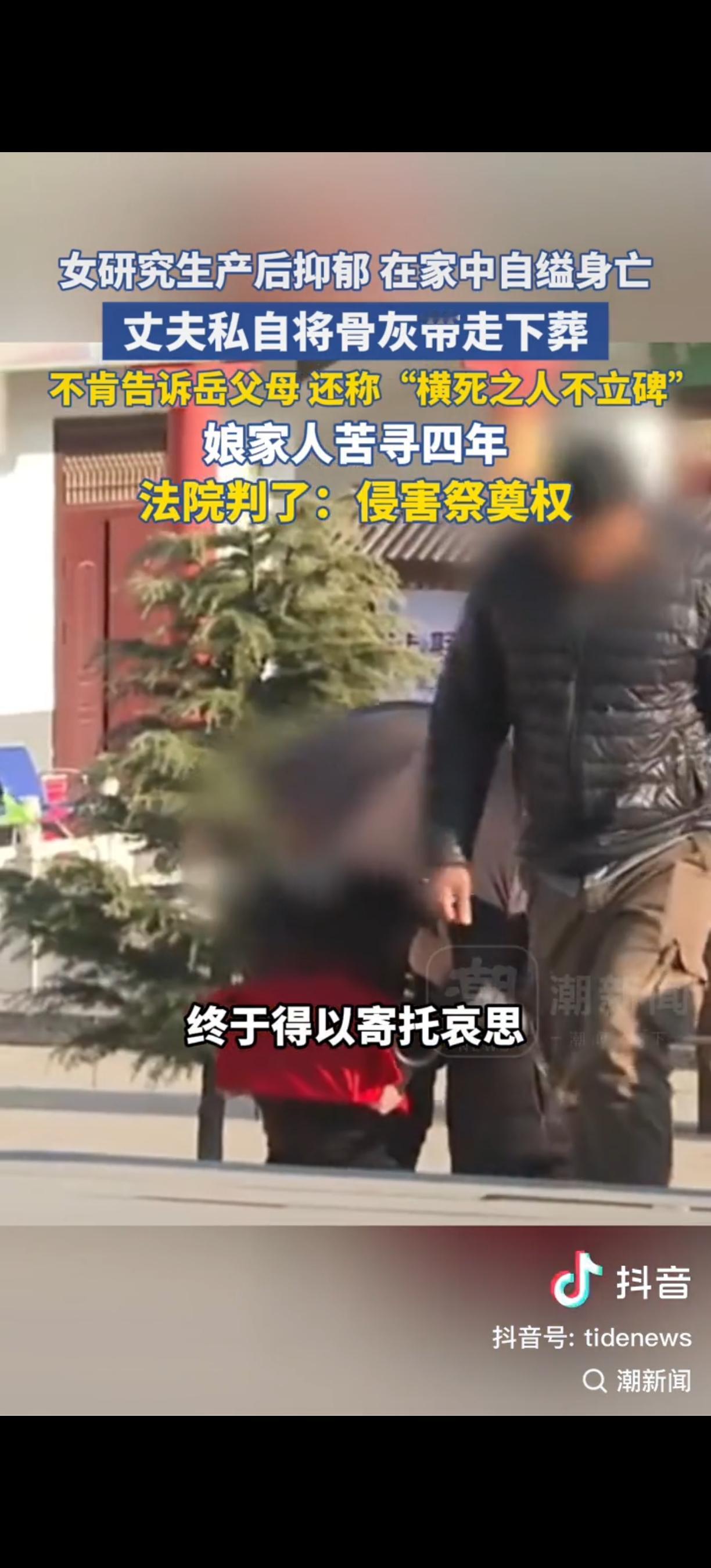 上海,一女研究生在生完孩子后,因强势的母亲和婆婆都来带娃,让本来幸福的小家庭摩擦不断。后女研究生因抑郁症在家自杀身亡。丈夫心灰意冷,带着爱妻的骨灰回到河北老家,但因为爱妻是自缢身亡,按照当地习俗是不能立碑的,这也导致岳父母一直找不到女儿的墓地。后岳父母将这个女婿告上法院,要求其履行告知义务,且为女儿迁墓地。 女子小宁(化名)和丈夫刘先生(化名)结婚后生下女儿,本来是幸福的一家。可生完孩子后,母亲和婆婆都来上海帮忙带娃,两人都很强势,育儿观念又不一样,经常吵架。小宁夹在中间,压力越来越大,最后得了抑郁症,在家自缢身亡。 办后事时,小宁的父母和刘先生发生了激烈冲突。刘先生竟私自把小宁的骨灰带回河北老家安葬,还隐瞒了墓地位置。 小宁的父母苦寻了四年都没找到女儿的墓地,伤心又愤怒,就把刘先生告上了法院。法院判刘先生侵害了岳父母的祭奠权,要求他告知墓地位置。 刘先生这才说出了墓地定位,可因为当地习俗“横死之人不立碑”,墓地没有墓碑,小宁的父母还是找不到。 后来经法官调解,刘先生同意迁墓。2024年年底,小宁的父母终于找到了女儿的安葬之处,得以寄托哀思。 这事传开后,大家的看法很不一样。有人觉得刘先生太过分,妻子没了,还不让岳父母知道墓地在哪,太不孝顺。也有人觉得,刘先生可能是因为妻子自杀心里有坎,加上当地习俗的压力,才做出这样的事。 其实,这种家庭矛盾和习俗冲突的事,挺让人揪心的。一边是失去女儿的父母,想找到墓地寄托思念;一边是失去妻子的丈夫,被习俗和心理创伤困住。 希望大家在家庭相处中多些理解和包容,遇到心理问题及时寻求帮助,别让悲剧发生。同时也希望类似的习俗能更人性化一些,别让生者的哀思无处寄托。 各位读者你们怎么看?欢迎在评论区讨论。 来源:看看新闻 潮新闻 2025-12-10报道