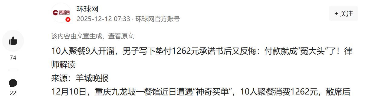 这种朋友不要也罢!重庆一男子和9个朋友聚餐,总共吃了1262元,结果,其余9人都陆陆续续借口离开了,最后只剩下男子一人,老板找到他结账,男子却说是朋友组局,应该朋友结账,自己无力支付,看着对方耍赖的模样,餐馆老板直接报了警! 这事发生在 12 月 10 日的重庆深夜,九龙坡区一家街边餐馆都快打烊了,本该清净下来,结果因为一桌食客闹得不可开交,当天傍晚张先生跟着九个 “朋友” 一起来这家餐馆聚餐,十个人热热闹闹坐了一大桌,点的全是大鱼大肉,吃得那叫一个红火,从傍晚一直吃到半夜 12 点,酒足饭饱之后,谁也没想到接下来会发生这么狗血的一幕。 餐馆老板郑先生一开始还挺开心,十个人的大桌可是笔不小的生意,看着大家吃得尽兴,他也没多想,可随着夜色越来越深,桌上的食客开始陆陆续续找借口离席,有人说去上厕所,有人说接个电话,还有人说临时有事要先走一步,理由五花八门,看着都挺合理。 老板当时忙着收拾其他桌子,也没太留意,等他反应过来拿着 1262 元的账单走到这桌前时,当场就愣住了,诺大的圆桌空荡荡的,只剩下张先生一个人还坐在那儿,正低头刷着手机,完全没意识到身边的人早就跑光了。 老板喊了一声 “麻烦结下账”,这才把张先生从手机世界里拉回来,他抬头一看,身边连个朋友的影子都没有,刚才还称兄道弟、推杯换盏的人,居然全都脚底抹油溜了当场就懵了。 他赶紧跟老板解释,说这局根本不是他组的,自己就是被喊来蹭饭的,一分钱都没带,按理说该组局的人结账,怎么也轮不到他。 可站在老板的角度,这事就简单多了,饭是你们十个人一起吃的,菜是一起点的,现在另外九个人全跑了,总不能让餐馆承担这一千两百多块钱的损失吧? 在老板看来,这跟 “吃完霸王餐想赖账” 没区别,眼看着张先生两手一摊,一副无力支付又不想负责的模样,老板被逼得没办法,只能选择报警处理。 民警赶到后,现场的僵局才算暂时缓解,但局面依然很戏剧性,民警好不容易通过张先生提供的联系方式,找到了那个所谓的 “组局者”,结果电话那头的回答让人哭笑不得,对方不仅没有半点要解决问题的意思,反而理直气壮地说 “我也没钱,正在筹钱”。 就这样双方僵持了快一个小时,在民警的反复协调下,张先生为了能先脱身,只能无奈写下一份承诺书,承认了这笔债务,还把自己的身份证押在了餐馆里,约定好第二天下午 6 点前,一定把 1262 元餐费补齐。 餐馆老板按照约定时间联系张先生,等来的不是转账提示音,而是一句 “我不想当冤大头”,原来张先生回家后左等右等,那个承诺要筹钱的组局者,直接玩起了 “失踪”,电话不接微信不回,彻底没了音讯。 张先生越想越不对劲,自己本来就是蹭饭的,结果被朋友甩在原地,还被逼着写了承诺书,要是真自己掏腰包付了这一千多块钱,跑路的那九个人不仅没半点损失,自己反倒成了被随意拿捏的傻瓜,这口气换谁也咽不下去,这钱他自然也坚决不想出。 对于餐馆老板来说,这十个食客就是一根绳上的蚂蚱,他完全有权利要求其中任何一个人先垫付全部餐费,也就是说不管张先生觉得多委屈,从法律上讲,老板找他要这 1262 元是完全合法的,他之前写下的承诺书,也不是随便写写的,而是具备法律效力的付款依据。 现在张先生陷入了两难,不付钱吧可能会被餐馆起诉,付钱吧又觉得自己太冤,成了替罪羊,其实他要是真想不吃这个亏,唯一的办法就是先把钱付了,然后再拿着付款凭证,起诉另外那九个不讲武德的 “朋友”,让他们每个人分摊自己该出的那份,按十个人平均分,一个人也就一百二十几块钱,根本不算多。 可问题在于那九个人现在装聋作哑,明显就是赌张先生不会为了这百把块钱较真,觉得能赖就赖,他们大概忘了现在餐馆里到处都是监控摄像头,真把老板逼急了走诉讼程序,这一千多块钱加上诉讼费是小事,可 “吃霸王餐跑路” 的名声传出去,以后谁还敢跟他们打交道? 而对于张先生来说,这场饭局的代价实在太惨痛了,不仅面临着被起诉的风险,还平白无故惹了一身麻烦,更重要的是,花了 1262 元,看清了九个所谓 “朋友” 的真面目。 都说患难见真情,可这顿饭连患难都算不上,只是一顿普通的聚餐,就让这些人暴露了本性,为了几百块钱就把朋友当挡箭牌,这种只懂占便宜、毫无责任感的人,根本不配做朋友。 (信息来源:环球网)