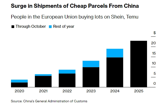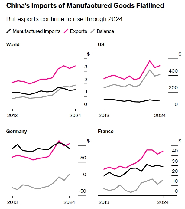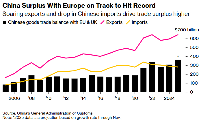 中国对欧盟顺差超过对美,贸易压力加剧前11月对美顺差2608亿美元,对欧盟顺差2702亿美元。预计全年对欧盟顺差约3000亿美元,将历史性地超过对美顺差。这个转折对欧洲来说尤其难以接受。因为就在2019年,德国对中国还有250亿美元顺差,而今年前11月转成230亿美元逆差。根本原因是图二,中国制造业进口自2013年以来没有增长,而制造业出口却大幅增长,无论对全球、对美国、对德国都是如此。2024年中国制造业顺差2万亿美元,超过了制造业进口,即使原材料大幅逆差,最后也有1万亿美元顺差。而欧盟就是依靠制造业竞争力的,对竞争很害怕。现在欧盟只有7%的出口是对中国的,但有25%的进口是从中国来的。而且中国的优势不仅是新出现的汽车等高科技业务,传统的领域继续保持,还高速增长。图三,2025年前10月,中国对欧洲小包裹出口增速是56%。欧洲人的抱怨还包括汇率,虽然对欧洲大幅顺差,但人民币对欧元贬值到10年最低。现在情况是,欧洲人想学美国对中国加关税、设置贸易壁垒。但是又怕对抗起来无法承受,因为欧洲人生活并没有多好,进口中国商品有助于维持生活。欧盟在中国也有不少公司利益要维护,各国态度差异很大。俄乌冲突得到的关注更大,中欧贸易矛盾还只是数字问题。这就是欧洲的拧巴状态,想搞事,但也不好搞。