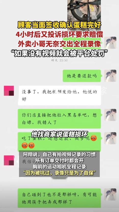 “差点被白嫖!”12月9日,江苏苏州,一外卖小哥给顾客送蛋糕,当着面让对方检查了一下,在确认没有问题后,顾客签收了蛋糕,可过了一会,顾客竟找到商家索赔,说蛋糕损毁了!幸好小哥录有视频,不然就要扣钱了。网友:碰瓷的成本太低! 现在外卖行业非常发达,不仅可以点饭吃,还能买生活用品、水果等,只需要等待二十几分钟,就能送货上门,受到了人们的一致好评。 阿翔就是一位外卖小哥,当天晚上,他接到一笔新的订单,送一个生日蛋糕到商场,他立即赶往商家取了货,随后马不停蹄地前往顾客所在的地方。 由于蛋糕非常容易摔坏,再加上一路的颠簸,即使阿翔再小心,内心依旧不安。 见到顾客后,阿翔将蛋糕拿出来让对方先检查一下,如果有损坏自己会进行赔偿,顾客再三确认后,没有发现问题,于是就签收了。 送完货后阿翔继续送其他单子去了,本以为事情到此结束,不料等他下班回家时,却突然收到商家的消息,顾客投诉那个蛋糕路上摔坏了,要赔钱。 阿翔意识到对方是想白嫖,于是将记录仪视频发给了商家,接着商家又发给了顾客,顾客就不再说话了。 网友看后表示,外卖平台加强消费者的维权功能确实是好事,只是没想到会被有心之人利用,如果不是有视频,那么小哥的损失谁来赔? 信息来源:《外卖小哥配交付记录仪 甩录像应对“天坑顾客“ 有人当面确认蛋糕完好 3小时后又投诉损坏要求赔偿!》红星新闻