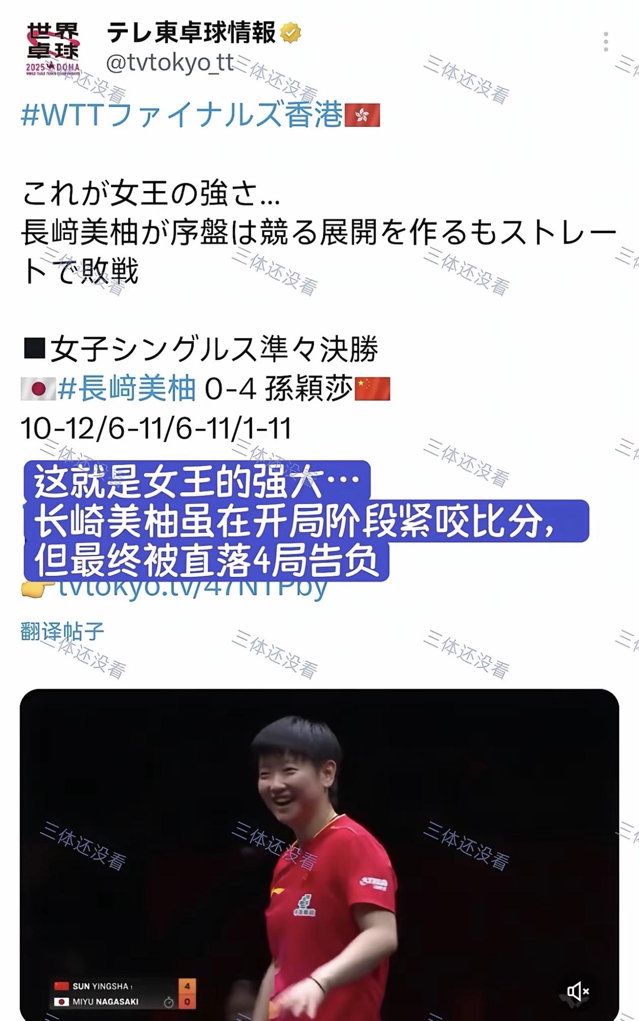 孙颖莎4-0长崎美柚:日媒惊呼“女王”不可战胜! 日媒认为,长崎美柚面对莎莎,完全没有办法,在乒坛女王面前,长崎美柚甘拜下风。 这可不是第一次称呼孙颖莎为乒坛女王,几乎每次有比赛,莎莎获胜,日媒都会抬出女王的称呼,给莎莎戴上。 东瀛这个民族,只尊重强者,当你能够完全压制他,他就会真的尊重你!