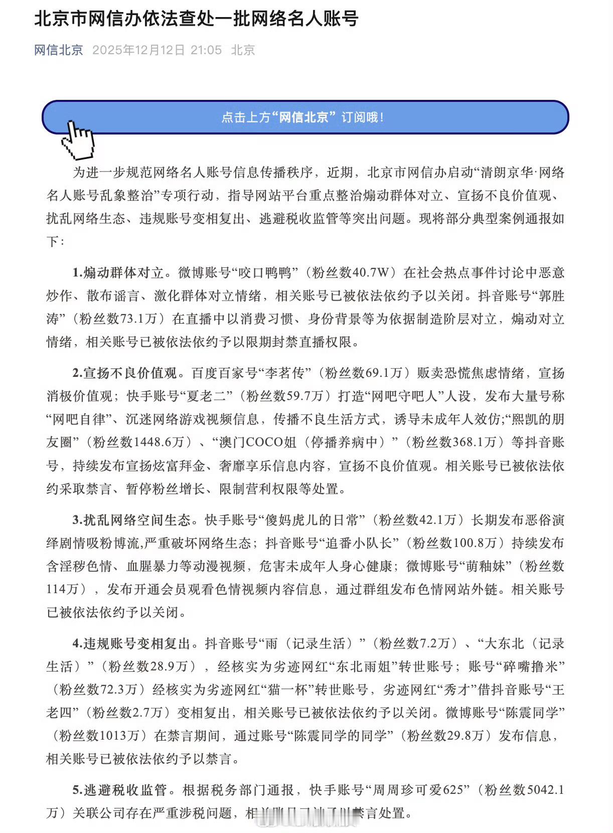 东北雨姐转世账号被关闭网信办通报了一批多平台封禁账号情况,其中就包含网红陈震,还特意处理了违规变相用小号复出转世的情况,包括陈震小号亦如此,个人行为违法,是按人封禁处理,不是按账号处理,支持网信办严厉打击这类账号,净化网络环境