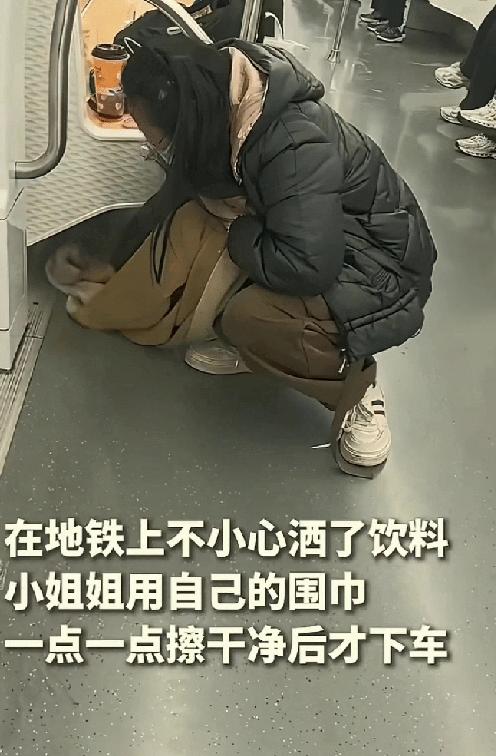 没想到上人民日报了!苏州一女生坐地铁时,不慎将奶茶打翻,座椅和地上全是奶茶,她包里纸用完了都没弄,眼看要到站了,都以为她会不管了,结果,她竟然解下自己围巾,将奶茶全部擦干净才下车。 这个看似普通的举动,随后引发了全网点赞和一场温暖的“寻人行动”。 那天在苏州地铁11号线列车行驶至昆山段顺帆北路时,车厢里发生了一幕小小的意外。 一位女乘客的饮料纸袋破了,导致奶茶洒在座椅上和车厢地板上。 只见她立即站起来用纸巾擦拭,并让坐在旁边的老人换到对面座位。 然而,黏稠的奶茶渍很难彻底清理干净,在她用完了自备的纸巾后,做了一件让所有乘客惊讶的事,解下脖子上的围巾,继续擦拭地面。 这位女乘客姓顾,是苏州工业园区一家公司的职员,当天刚下班准备回家。 奶茶打翻后,她没有慌张,而是立刻采取行动。 根据监控画面显示,顾女士先是使用自备纸巾清理地板及座位上的明显污渍。 “当时发生小意外后,我看了一下身边没其他合适的工具,所以纸巾用完了就用围巾擦干净。”顾女士后来回忆道。 而作为两个孩子的母亲,她平时非常注重家庭教育,认为“自己要先做好行为表率,尽量把每一件小事做好,给孩子一个正向的引导”。 当时在车厢里的乘客们目睹了她细心清理的过程。 她不仅擦拭了地板,还把座位上的污渍也擦得干干净净。 而且在检查了地面和座椅确认无残留后,她才整理自己的物品准备下车。 就在12月5日,苏州地铁官方在社交媒体上发布消息,发起“全网寻人”行动。 而且地铁方在发布的视频配文中称:“你用围巾擦奶茶的样子超美!为你点赞!”。 苏州地铁表示,为了感谢这位乘客,特地为她准备了新的围巾,还要赠送一份文创大礼包和食堂餐券。 而这一举动引发了广泛关注,网友们纷纷为这位女乘客点赞。 地铁工作人员还重申,日常遇到类似情况可联系站务人员处理,并对乘客自觉维护车厢环境的行为给予表扬。 正是这种积极的回应机制,体现了城市管理的人性化温度。 12月7日,经苏州广电总台蟹视频确认,这位“围巾擦地”的女乘客找到了。 这个顾女士是苏州吴江盛泽人,家住昆山,是一名“80后”两个孩子的妈妈,大女儿读高一,小女儿上小学。 面对突然走红,顾女士低调地表示:“这是个微不足道的事,我只是做了自己该做的。” 显然她没想到自己一个小举动会引起这么大的反响,并认为“其实我身边这样优秀的、素质高的人太多太多,我只是那个小小的缩影”。 而顾女士的闺蜜钱女士看到网上热传的寻人视频后,一眼就认出了与她有37年友情的挚友。 她称赞顾女士“善良、谦逊、聪慧,性情温和,乐于助人”,从小到大一直品学兼优,但从不摆架子。 之后这段视频在网络上迅速传播,相关话题在12月6日登上微博热搜。 当时评论区瞬间被温暖和赞扬淹没,网友纷纷为这位女乘客点赞。 有网友评论说:“为漂亮有担当的小姑娘点赞”、“高素质小姐姐”、“为这位美女点赞,正能量!” 而顾女士的行为之所以引发广泛共鸣,是因为它展现了一种朴素的担当精神。 在公共场合,不慎造成污渍后悄然离去的情形并不少见,而顾女士主动以私人物品清理的举动,打破了“事不关己”或“等待清洁”的惯性思维。 虽然这种自发行为,虽然不是惊天动地的大事,却生动诠释了“主人翁意识”。 它告诉我们,文明不是高高在上的标杆,而是做好每个人分内之事的自然结果。 有着这样品质的人真的很少。 而苏州地铁方的回应也值得称道。 他们没有让这个温暖的故事止于网络热议,而是主动寻找、公开致谢、准备礼物。 这种来自社会系统的认可,既能增强行善者的获得感,也有助于塑造“德者有得”的良好预期。 当城市管理带着温度,市民的文明举动就有可能从偶然变成常态,由个别人带动越来越多的人。 而这种个人与城市之间的良性互动,正是现代城市文明建设的生动体现。 顾女士的行为不仅维护了公共环境,更触发了社会正能量的循环。 那么每一次这样的善行被看见、被肯定、被传播,都能形成正向激励,鼓舞更多人参与其中。 顾女士用围巾擦地的举动,弄脏的是一条围巾,擦亮的是城市文明的底色。 在事件结束后,顾女士的生活回归平常,但这个故事传递的温暖仍在延续。 这个发生在苏州地铁上的小插曲提醒我们,文明往往就体现在我们如何应对意外的小事上。 当每个人都愿意像顾女士一样,为自己的行为负责,共同爱护公共环境,我们的城市将会变得更加美好。 正如顾女士所说,每个人都能用自己的一份力,来守护我们的城市。 正是这种由己及人的友善和自觉,会在整个社会静静流淌,形成城市最坚实的文明基础。 如果人人都献出一份爱世界将变成美好的人间,为她点赞! 主要信源:(女乘客地铁上用围巾擦地!本人回应——人民日报)