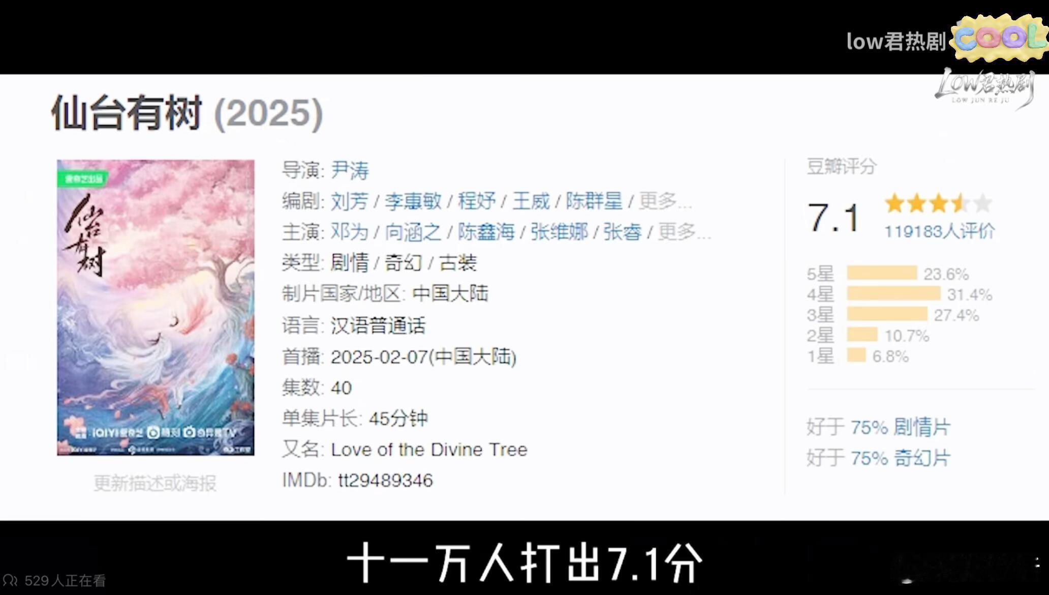大眼杯表彰小会 著名up主low君推荐2025十大冷门好剧,邓为首部男主剧《仙台有树》入选。此剧以超11万人打分7.1,成为2025年评分最高的仙偶剧,也打破当时爱奇艺云包场纪录。高品质好剧,只是欠在营销。