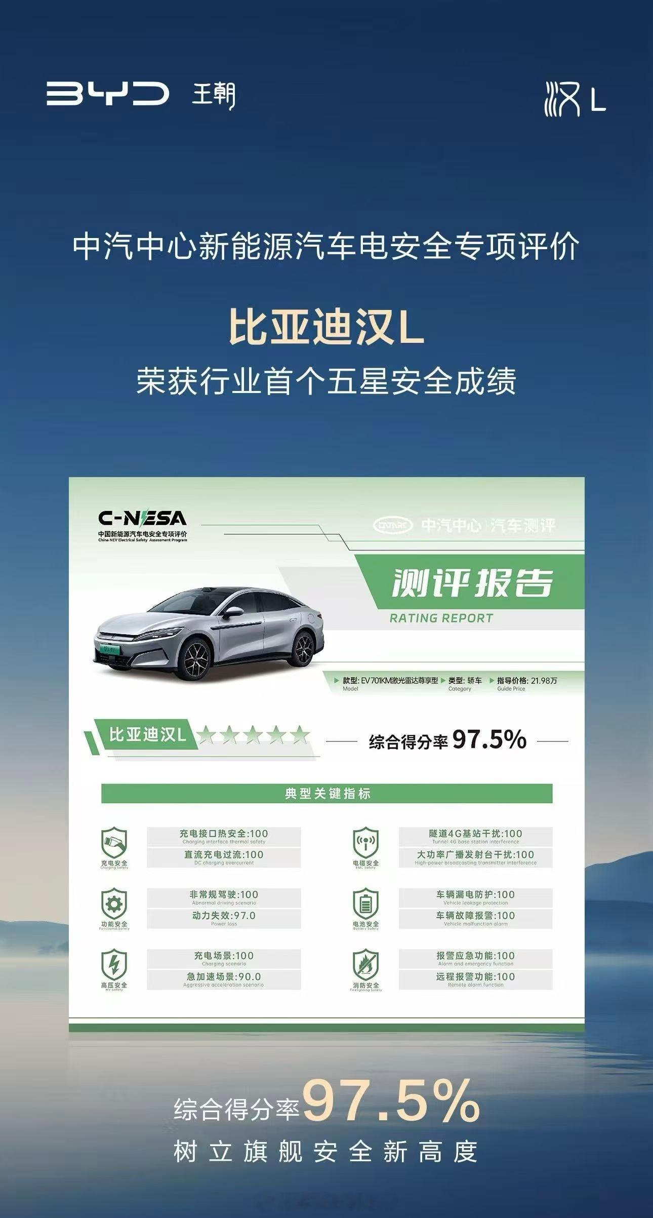 中汽中心新能源汽车电安全评测成绩公布比亚迪汉L,荣获行业首个五星成绩,综合得分率97.5%!这就是满分车型啊!大v聊车新能源汽车