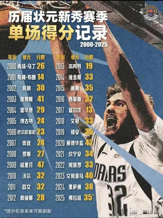 刚才看到网友整理分享2000年以来历届状元新秀赛季最高得分,发现只有四人得分超过40分(2025年状元暂时不计),同时成为历史级巨星也很少,2013年应该是最水的吧,除了詹姆斯之外,你们觉得谁是这个名单中的第一人呢?