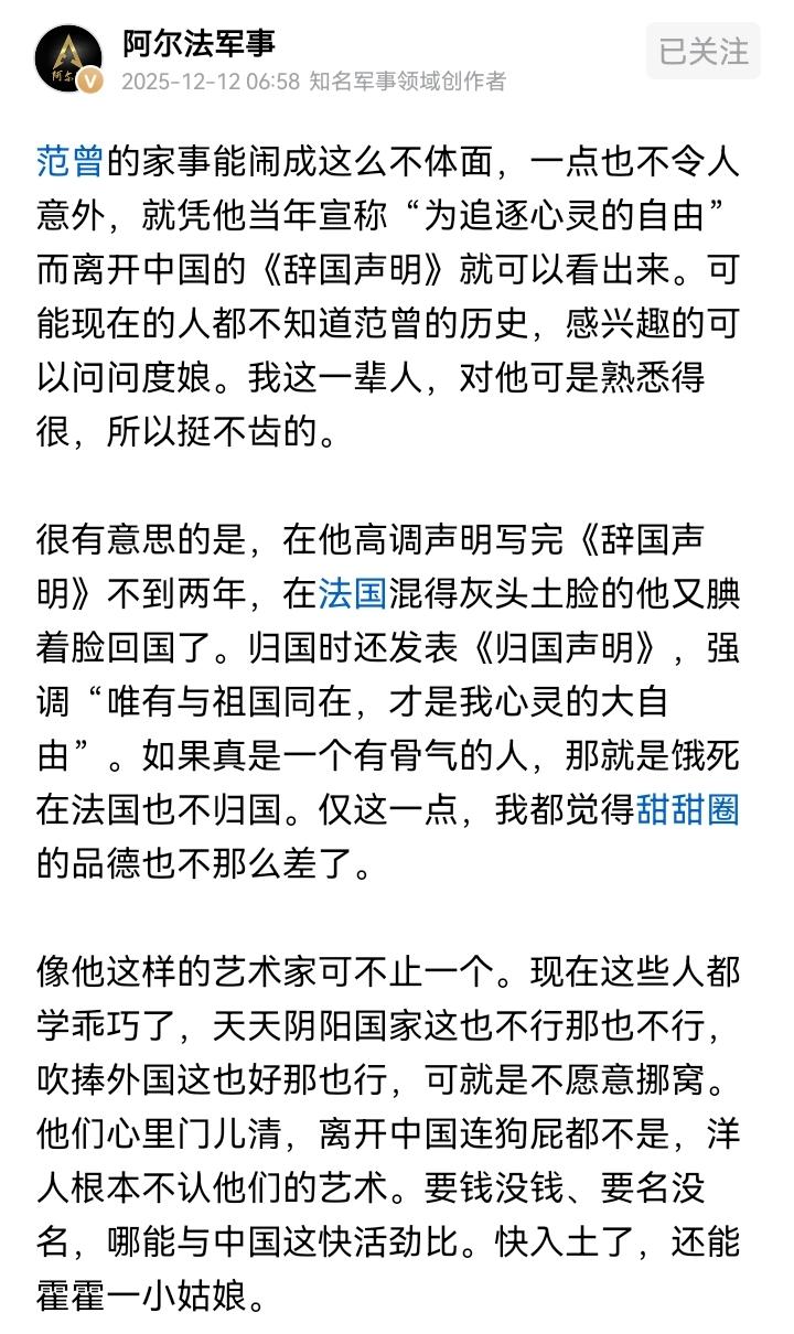 阿尔法作为一名优秀的军事博主,最近不评论军事话题,反而对登上热搜的87岁老来得子的艺术家范曾评头论足,但是他评的不是人家老来得子,也不是人家断绝父女关系。而是说范曾端起碗来吃肉,放下筷子骂娘的行为! 恕我孤陋寡闻,以前只知道有这么个人名,然后现在又娶了娇妻在87岁喜得贵子,一时间为大家所熟知。 但是根据阿尔法的说法,范曾在国内赚得盆满钵满,却还说自家这也不行那也不行。在国外混不下去,又觍着脸回来的人注定是德不配位。 所以,他有如此品德,那他为何会断绝父女关系,就不难理解了。怪不得阿尔法对他也是嗤之以鼻。 对于这样品格的艺术家,真的值得大家追捧吗?