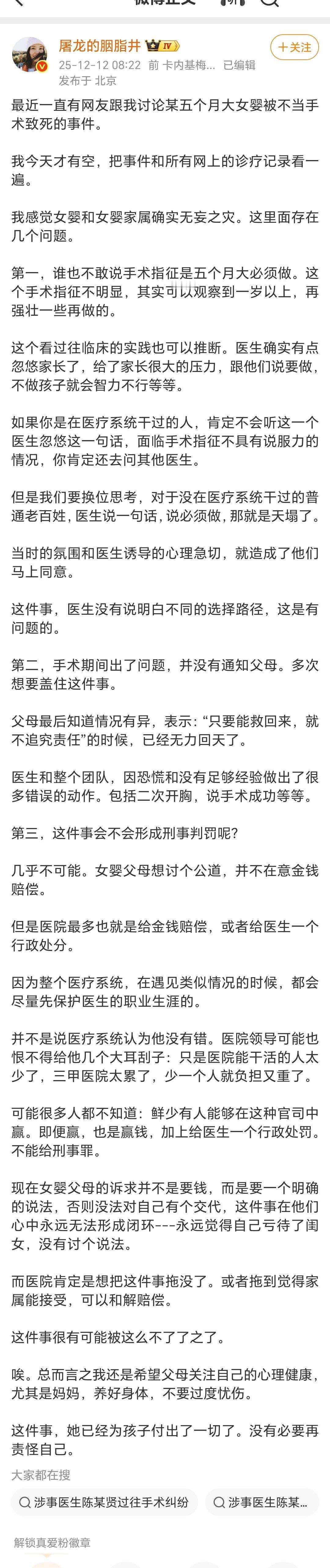 知名大V:五个月大女婴被不当手术致死 这件事很有可能被这么不了了之了。对此你有什么看法?