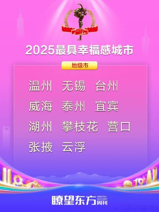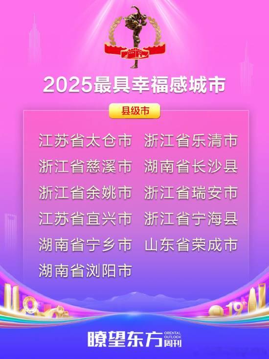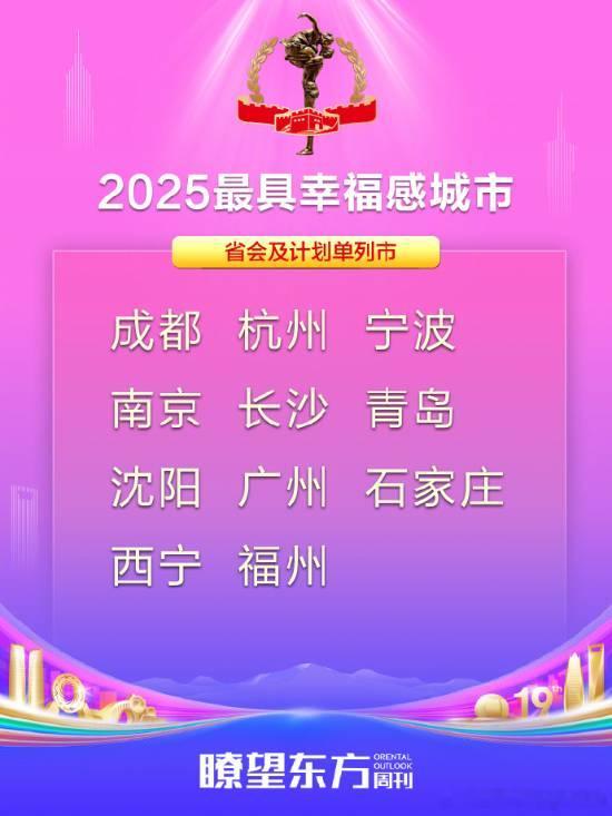 2025年我国最具幸福感城市一览:你所在城市入选没?“2025最具幸福感城市”调查推选结果正式发布。据悉,2025年度调查推选活动历时3个多月,通过大数据采集、问卷调查、材料申报、实地调研和专家评审等环节的严格遴选,成都、杭州、宁波、南京、长沙、青岛、沈阳、广州、石家庄、西宁、福州被推选为“2025最具幸福感城市”(省会及计划单列市)。此外,温州、无锡、台州、威海、泰州、宜宾、湖州、攀枝花、营口、张掖、云浮被推选为“2025最具幸福感城市”(地级市);北京市西城区、上海市闵行区、上海市徐汇区、北京市丰台区、北京市石景山区被推选为“2025最具幸福感城区(直辖市辖区)”;宁波市鄞州区、成都市双流区、杭州市富阳区、广州市天河区、杭州市临安区、成都市温江区、温州市鹿城区、台州市黄岩区、日照市东港区、张掖市甘州区被推选为“2025最具幸福感城区”;江苏省太仓市、浙江省乐清市、浙江省慈溪市、湖南省长沙县、浙江省余姚市、浙江省瑞安市、江苏省宜兴市、浙江省宁海县、湖南省宁乡市、山东省荣成市、湖南省浏阳市被推选为“2025最具幸福感城市”(县级市)。“最具幸福感城市”调查推选活动由《瞭望东方周刊》主办,迄今已连续举办19年,累计推选出100余座幸福城市(区),成为目前最具影响力的城市主题活动之一。