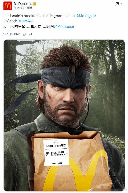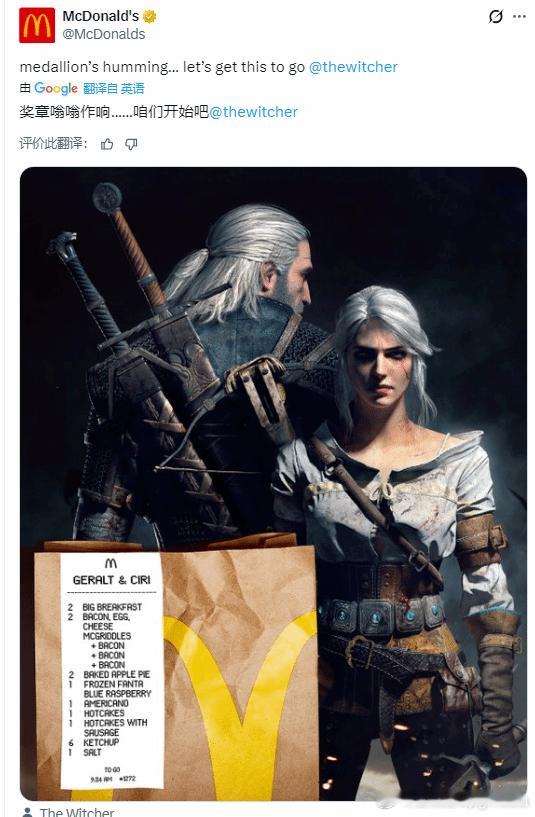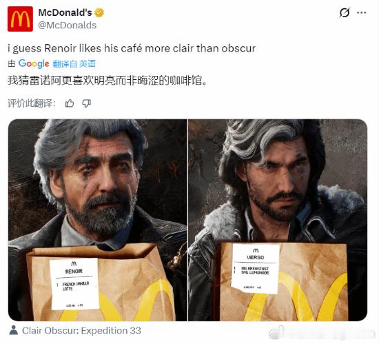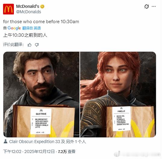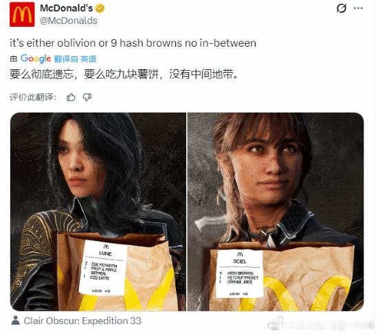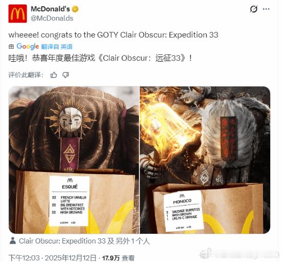 麦当劳庆祝《光与影》年度最佳:请你们吃早餐在TGA颁奖典礼期间,国际快餐连锁品牌麦当劳通过社交媒体发布了一系列创意联动动态,为多款热门游戏的主角们量身设计了他们“最爱”的麦当劳早餐套餐。本届TGA上,由法国团队Sandfall Interactive开发的《光与影33号远征队》以斩获9项大奖的成绩成为最大赢家,包揽了包括年度最佳游戏、最佳游戏指导、最佳叙事、最佳艺术指导、最佳配乐/音乐、最佳表演、最佳独立游戏、最佳首秀独立游戏及最佳RPG游戏在内的重磅奖项,创下了该颁奖礼的历史获奖纪录。麦当劳也特意发文,为这款游戏的卓越成就表示祝贺。