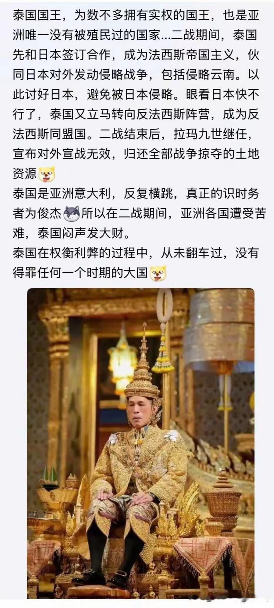 真是想不到,泰国原来是墙头草,哪边有风哪边倒!这也是泰国能够在二战时期保证自身不受侵略,不受干扰的重要因素,这也是部分小国家在战乱时期的无奈之举,每次押宝都押对了,真是想不到。泰国这个小小国家曾经居然还侵略过中国,他们真是吃了居然敢如此的狂妄,二战后居然没有被追究责任,真是奇了怪了!这也是一些小国家的无奈,靠自己的实力无法撑起大局面,只能依附其他国家而生存,但是缺少是非观,生存才是他们的第一选择。嗯,只是让人很奇怪,泰国居然没有被追究任何的责任。