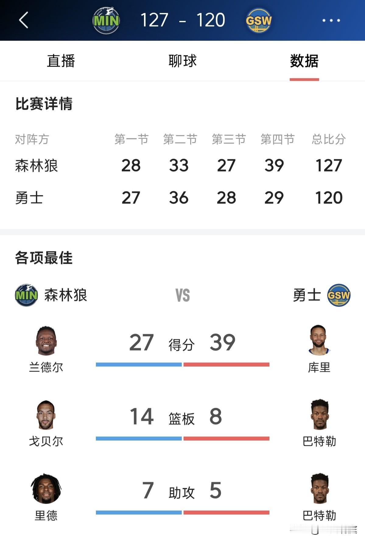 爱德华兹缺席,库里复出拿到39分,勇士主场120比127惜败森林狼。前段时间库里缺席多场比赛,如今勇士已经跌出西部前六,在竞争激烈的西部,原来伤缺的多位球星开始复出,勇士想要拿到一个季后赛席位还是有很大难度的。赶快去把字母哥忽悠过来吧!