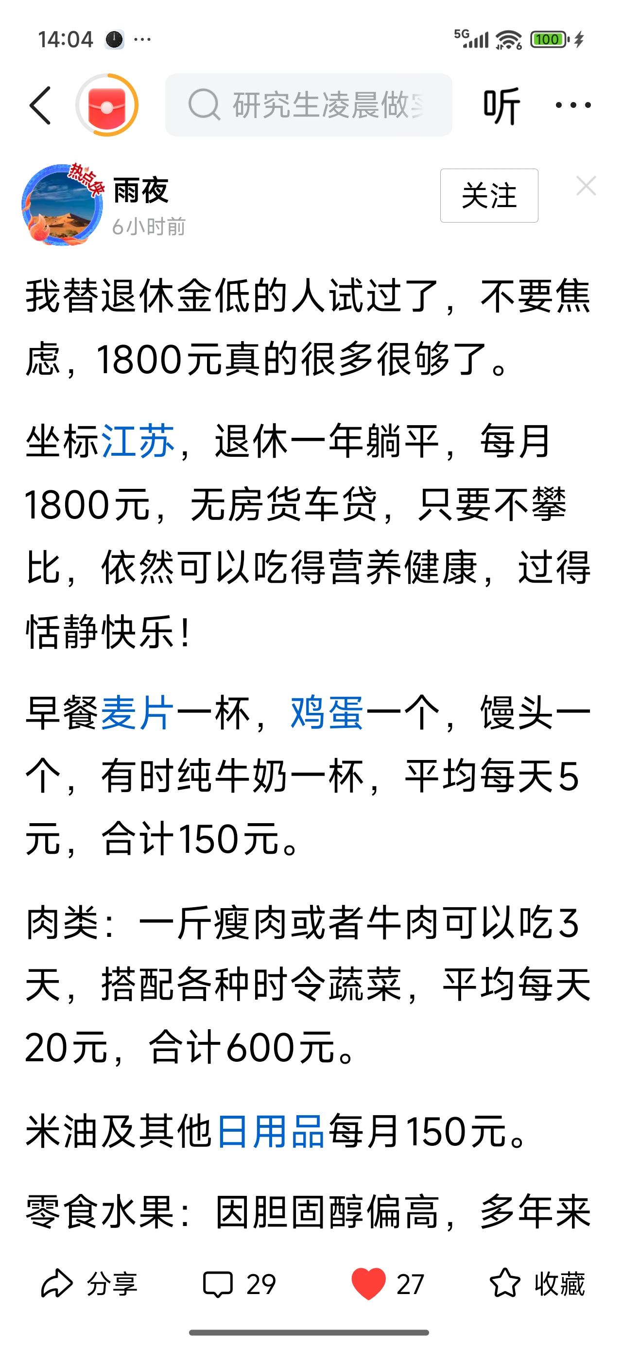 我妈妈退休工资3000多块钱,妈妈跟我两姐妹说,我不要你们的钱,你们两个人过好就行了。 而我因为房贷压力大,平时也没有什么剩余的钱可以给妈妈,就是过年会给个几千块,所以我总是很内疚,总觉得自己是一个不孝的人。 刚刚看到一位退休金1800块钱一个月的江苏友友说,一个月退休工资1800块钱,没有房贷,车贷也能够生活的很好。 不知道为什么,看到这里,我竟然有些放心了,也释然了。 我母亲在老家,一个月3000多块钱,青菜都是自家地里种的,鱼肉要花钱买点,还有一些人情往来上面要花一点钱,也不添置大件物品,基本上就不怎么花钱了。 看到这里,我相信3000多块钱应该过的也还不错,希望母亲身体健康,就是我们子女的福气! 其实平时的生活开销并不是很大,千把块钱也能够过一个月,就是每月的房贷压力大一点。 友友们,你们一个月生活开销要花多少钱啊?晒图笔记大赛 图片来自网络侵删!
