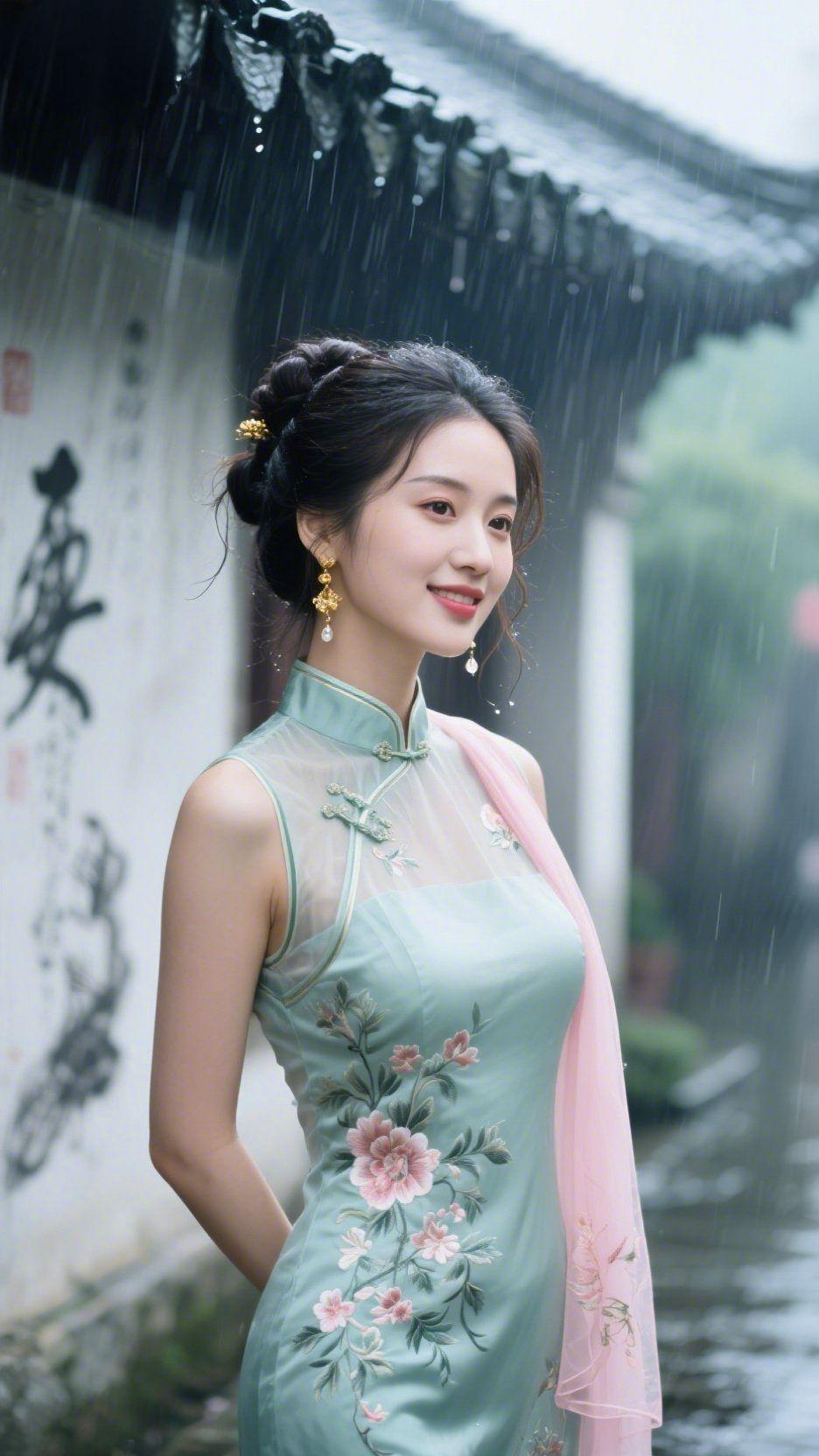 《雨巷青瓷衣》 雨丝轻裹巷弄,她立在檐下,浅青瓷旗袍像浸了雾的春。 盘扣轻合颈线,绣花粉白沾了雨润,粉纱巾随风轻垂——江南的软,似缝进了衣袂里。 抬眼时,眉梢染着雨雾的柔,唇色晕开浅润,没有浓饰的艳,是恰好的舒展。像檐滴轻落衣间,浸出层软融的韵。 清浅衫色,因雨意愈显温软:发鬓簪饰轻垂,耳坠随息微晃,连背影轻倚的弧度,都裹着江南的静甜。 这雨里的巷弄,大抵是把春的柔,揉作衫的韵,让寻常雨日都浸着生动的暖。 中式旗袍美学 江南氛围感