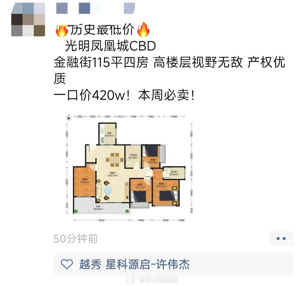 深圳光明笋盘,420/115=3.6万。 业主原购价600万左右。问了下,这边对着地铁。。。噪音不小,所以看自己能不能接受了。