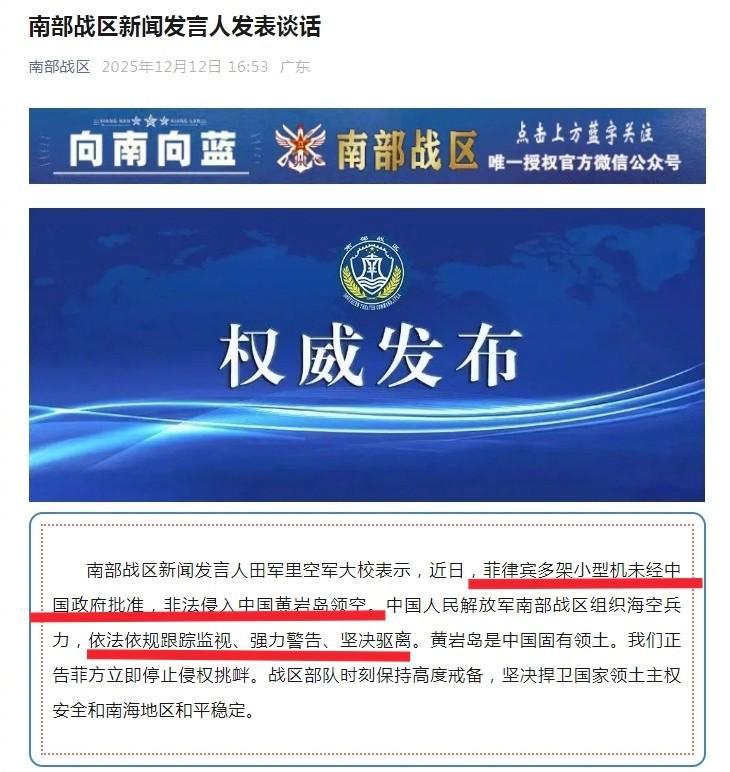 就在刚刚 黄岩岛出大事了?解放军驱离菲方飞机,菲律宾罕见沉默   黄岩岛周边又起风波,不过这次的主角并不是谁大声喊话,而是解放军南部军区的一纸强硬通报。   12日,解放军南部军区宣布,有多架菲律宾的小型飞机擅自进入黄岩岛领空,结果被中方海空兵力“强力警告、坚决驱离”。   这次官方用词明显升级,不再是之前那种温和的提醒,而是直接亮明了态度。与以往不同的是,菲律宾这次一反常态,竟然没有发布指责中方的声明,也没见他们媒体大肆炒作。   相比过去事事高调,这次的沉默让人不禁联想,或许是遭遇了超预期的反制措施。与此同时,菲律宾方面还派出了7艘渔业和水产业管理局的船只,试图在黄岩岛附近刷存在感。   这7艘船11号下午靠近黄岩岛东面约30海里,可没待多久,第二天就被中方力量驱离到70海里开外。   菲方事后嘴上说是“重新定位”,但实际上是被中方海警和“海上民兵”联合力量彻底赶离了现场。当天,中方在现场有至少6艘海警船和10艘民用船只待命,整体应对能力远超对手。   根据公开消息,这次对峙甚至可能动用了水炮等强力手段,菲方船只根本讨不到什么便宜。这次黄岩岛风波里,最引人关注的还有美方身影。   菲律宾的挑衅行动背后,美方多款军事装备高调亮相,像“的黎波里”号两栖攻击舰、P-8A巡逻机、MQ-4C无人机等,都在相关海空域出现过。   美方力量的现身显然给菲律宾壮了胆,也为其出格行动提供了心理依托。但现实摆在面前,中方的反制远比预期强硬。   南部军区的通报中,“强力”“坚决”这些字眼很少见,说明中国在维护领土主权和海洋权益时,底线越来越清晰。菲律宾这次突然沉默,背后其实有多重考量。   以往每遇到中菲摩擦,菲方往往会第一时间召开新闻发布会,甚至国际上四处“诉苦”。然而这次连带媒体都选择避而不谈,说明他们在这场对抗里并没有占到分毫上风。   中方联合多路力量,短时间内让菲方船只被远远驱离,事情发展之快、力度之大,显然超出了对方预判。对于菲律宾来说,主动炒作可能只会让自身处境更加尴尬。   还有一个不容忽视的背景,那就是美方对南海局势的长期介入。美方军事力量频频出现在热点海域,对有关国家的海上活动进行“护航”或者“监视”,为部分国家的冒进行为提供了外部支撑。   这次菲律宾敢于多管齐下,空中、海上同时挑衅,背后没有美方撑腰恐怕难以想象。但现实情况是,每逢美方装备高调巡航,南海相关国家就容易变得激进。   然而面对中方有力反制时,这些国家的应对往往变得极为被动。菲律宾这次的沉默,也许更多是对局势变化的无奈反应。   对中国来说,黄岩岛及其周边海空域的管控能力近年来显著增强。不仅海警、海上民兵体系协同作战,解放军三军也能根据事态变化随时提供支援。   像这次解放军直接通报空中驱离行动,信息发布透明、反应迅速,表明了中国对核心利益的坚定维护。   这种态度的转变,对于外部势力来说是明确的警示。只要有挑衅动作,中方就会用实际行动说话,维护国家主权绝不含糊。   从这次事件来看,黄岩岛周边的博弈已经升级为多方力量的现实较量。菲律宾一改过往的高调,选择低调沉默,侧面反映了中方反制的有效性。   美方的军事介入虽然为局势增添变数,但也加剧了地区局势的复杂性。对中国来说,只有继续完善海空一体防御体系,保持高压态势,才能让外部势力知难而退。   回头看这轮风波,黄岩岛依然是南海热点之一,但中国的态度和能力都在持续提升。对周边国家来说,冒险行为只会让自身陷入被动。   外部势力再多,也难以动摇中国捍卫主权和安全的决心。未来南海局势如何演变,还要看各方能否真正尊重地区和平与稳定的大局。   MCN双量进阶计划 参考来源:菲律宾多架小型机侵入中国黄岩岛领空,南部战区:强力警告、坚决驱离——观察者网 2025-12-12
