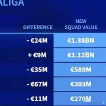 北京时间12月13日,在更新了西甲球员的身价之后,德转列出了西甲俱乐部最新的身价排行榜,皇家马德里以13.8亿欧元高居第一,巴塞罗那11.2亿欧元第二,马德里竞技5.89亿欧元第三。