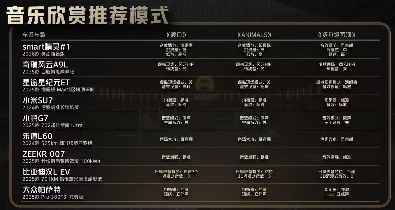 你的车适合听什么歌我说过,我青少年时代,最喜欢的就是坐着车,一路听歌一路看风景。至于现在么,感觉要是对号入座,比较适合听《ANIMALS》这种吧,Hifi模式是必开的,环绕声也是必开的,不然没有那种被声音包裹在中心的感觉。嗯,当然,首先是要有辆车。音响模式怎么调才好听