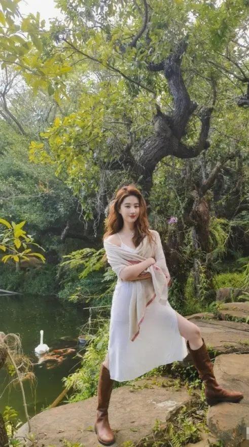 这张照片, 去掉刘亦菲, 就感觉是在一个普通的湿地公园里, 加上刘亦菲, 就感觉很高级! 她穿这个靴子, 不知脚臭不臭? 当然也是精修,不是随便,这种穿着和这个pose搭配起来,一般人很难hold住的。 拍神雕的时候, 是真嫩的滴水。