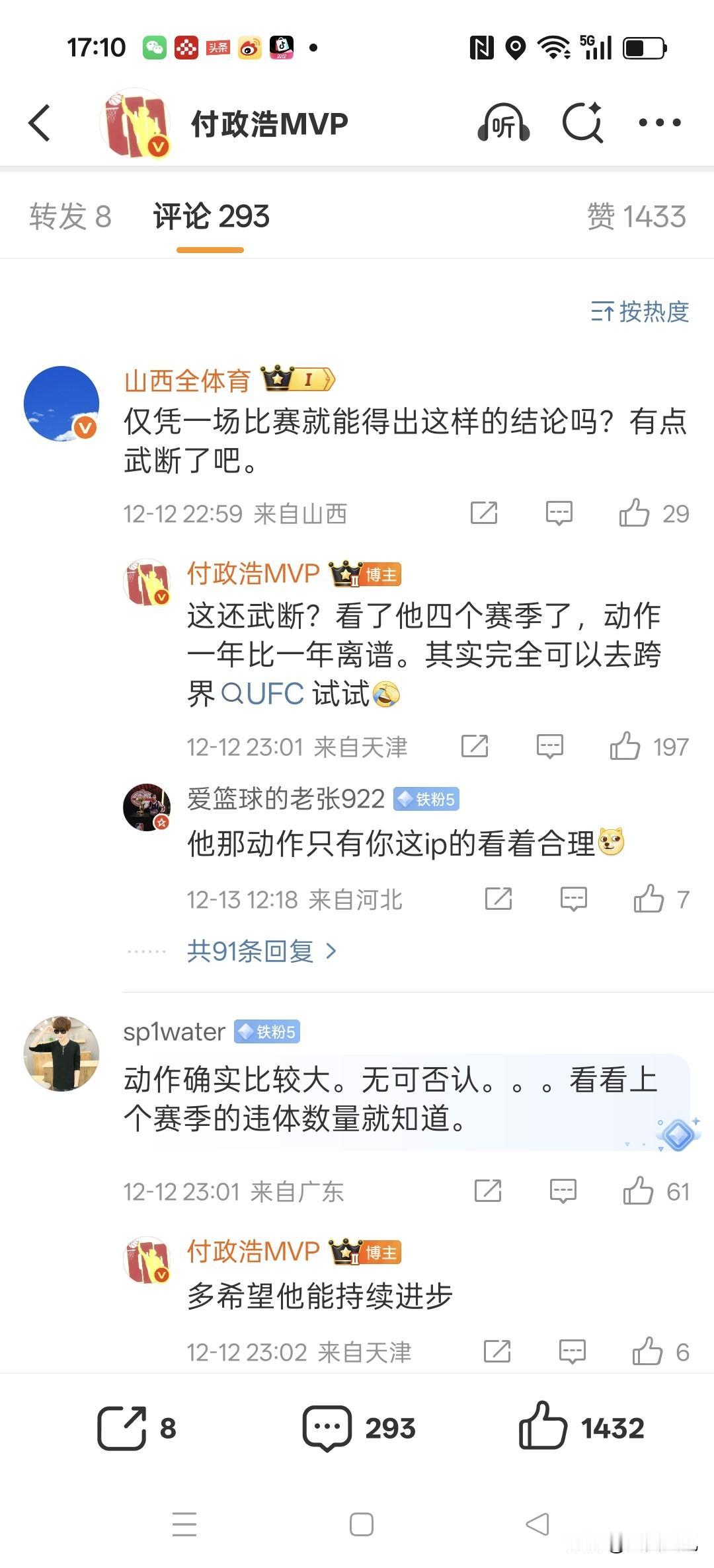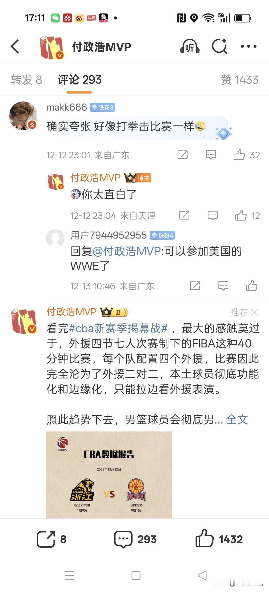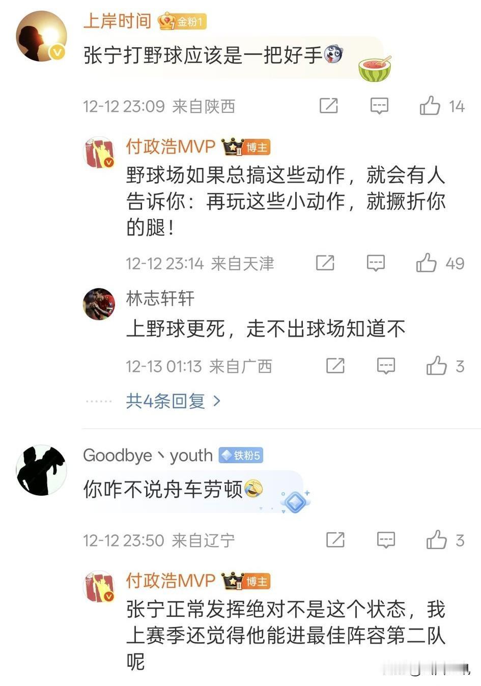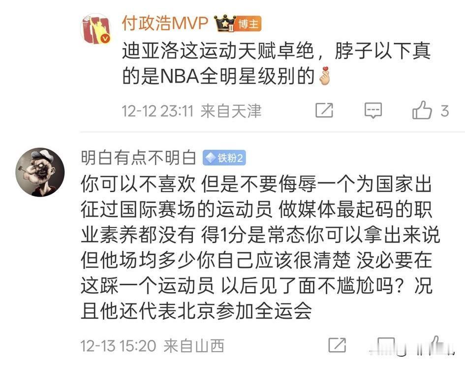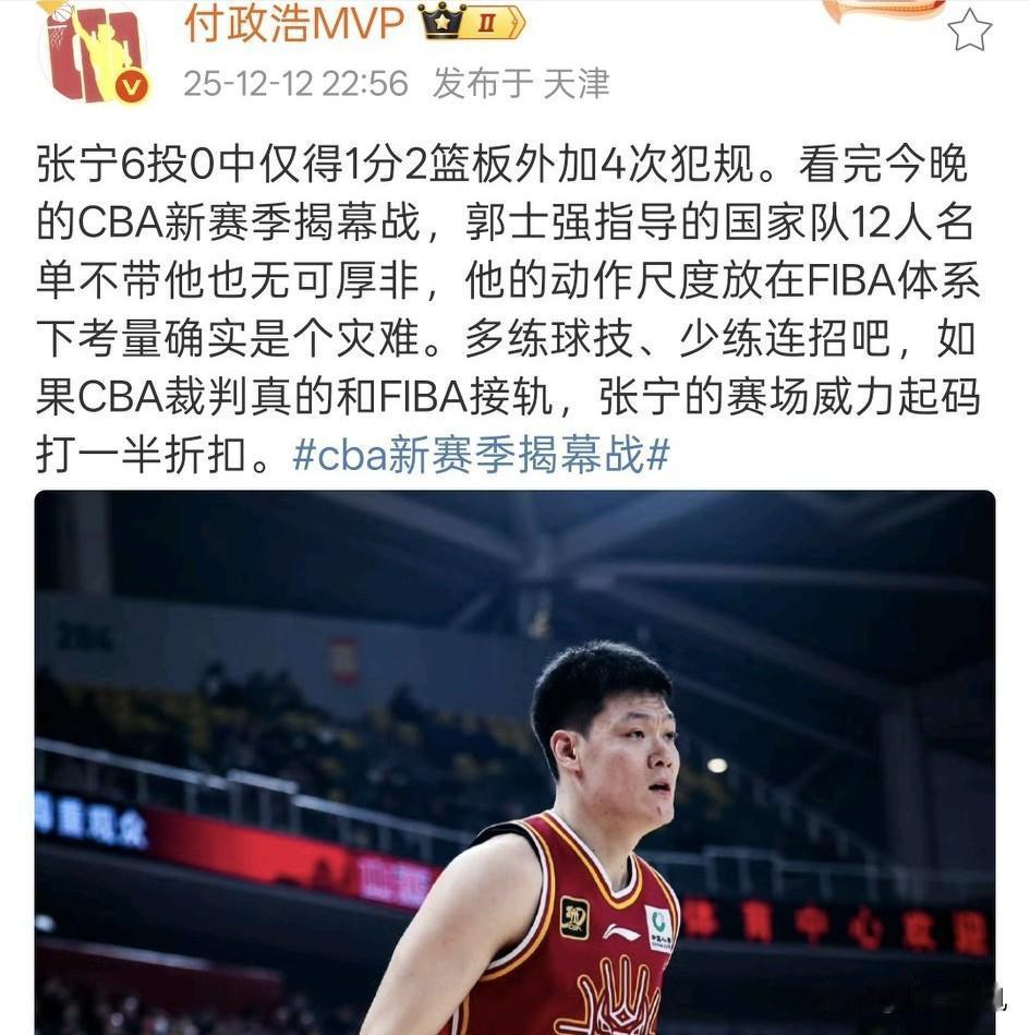 整场比赛得1分!张宁赛后遭到知名媒体人的公开诋毁,全国各地球迷纷纷仗义执言为张宁伸张正义! “张宁动作一年比一年离谱”,“迪亚洛脖子以下真的是NBA全明星级别的”。著名媒体人付政浩在昨天新赛季揭幕战之后发文千方百计贬低张宁,挖空心思讥讽迪亚洛,山西媒体人仗义执言表示不答应,明确指出“太武断!”于是,球迷们在他的微博账号下纷纷留言反驳对方的看法。 昨天晋浙揭幕战上,山西汾酒男篮球员张宁表现差强人意,6投0中仅得1分2篮板,外加4次犯规。于是媒体人付政浩发文认为:“看完今晚的CBA新赛季揭幕战,郭士强指导的国家队12人名单不带他也无可厚非,他的动作尺度放在FIBA体系下考量确实是个灾难。多练球技、少练连招吧,如果CBA裁判真的和FIBA接轨,张宁的赛场威力起码打一半折扣”。山西媒体人山西全体育跟帖指出:仅凭一场比赛就能得出这样的结论吗?太武断了吧!付政浩回复:这还武断,看了他四个赛季了。其实完全可以跨界UFC试试。说完这话,付政浩立马补充:希望他能持续进步! 看到这个话题,有来自山西IP的球迷留言:广东三场季后赛几个违体?此言之后没有人跟帖回复。 来自陕西IP球迷说:张宁打野球应该是一把好手。付政浩回复道:野球场上如果总搞这些动作,就有人会告诉你:再玩这些小动作,就撅折你的腿! 有广东IP球迷说,确实夸张,好像打拳击比赛一样。付政浩貌似赞同其说法附和道:你太直白了。有辽宁IP球迷质疑:如果徐杰打出这样的表现,你的评价完全不一样,这就是公正客观的广东自媒体?没有人跟帖作答。 在多人对张宁表现提出质疑之际,有IP辽宁球迷说:张宁是上届奥运会代表中国男篮参赛的四人之一! 抨击完张宁之后,付政浩含沙射影迪亚洛脑子不够用。他说:“迪亚洛这运动天赋卓绝,脖子以下真的是NBA全明星级别的。”言外之意,是说迪亚洛脖子以上的脑袋有毛病,不具备NBA水准。 看着网络上这样诋毁球员,来自山西IP的球迷终于站出来指批驳到:你可以不喜欢,但是不要诋毁一个为国家征战过奥运会的运动员。做媒体最起码的职业素养都没有。得一分是常态,你可以拿出来说,但他场均多少你很清楚,没必要在这踩一个运动员,况且他还代表北京打了全运会! 球迷怎么看待这场口水战?