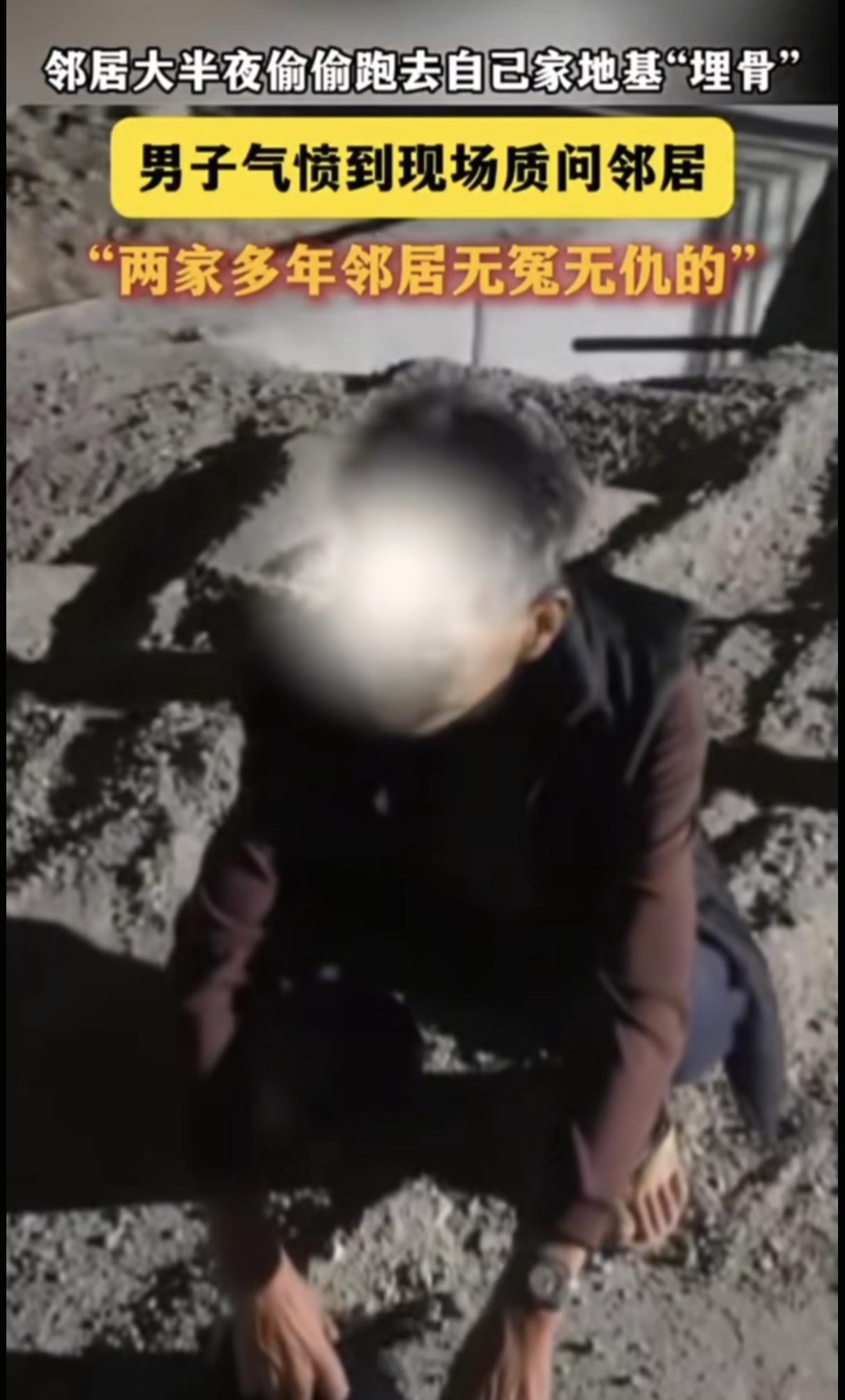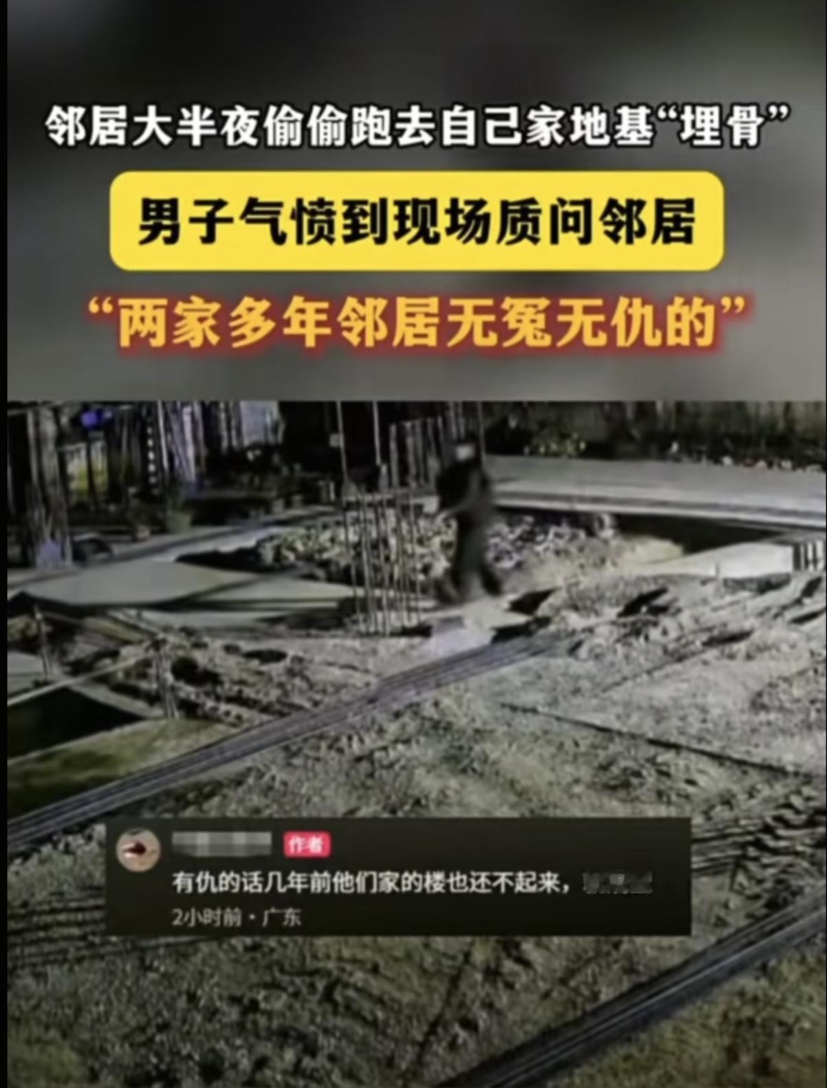 真让人后怕啊!男子盖房正在打地基,为了安全方便随时喊话,专门装了监控,没想到却意外拍下邻居鬼鬼祟祟的往地基里埋鸡鸭骨头。 监控显示,12月12日晚上快7点时候,邻居穿着黑衣服手提个塑料袋,找准了位置后,迅速把塑料袋扔进地基,用一旁的铁锨埋起来。 看着好像是提前算好了位置,男子走过去时候,一点不带犹豫的。 事发后家主看监控发现了邻居所为,把邻居叫来当面对质,让邻居自己将塑料袋挖出,才发现是鸡鸭骨头。 家主看到后说:“你心肠怎么这么坏!” 家主说和这位邻居无冤无仇,前几天还打招呼说呢,告知自己要盖房了,邻居还替他高兴呢,谁能想到背地里竟偷偷做出这么恶心的事情来。 看他偷偷摸摸的样子,埋的东西一定不是什么好事,家主随后报警处理! 报警后并通知了村委,现场村委与帽子叔叔对这位邻居进行了口头教育和批评。 盖房子是人生大事,谁都不想有意外发生,造成一辈子遗憾,邻居这么做确实太小人了,难道真的是嫉妒心作怪吗? 看来盖房子装监控还是很有必要的,毕竟人心隔肚皮,一辈子的大事,不能给了小人可乘之机!