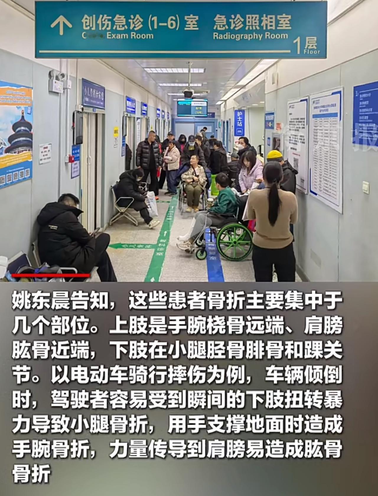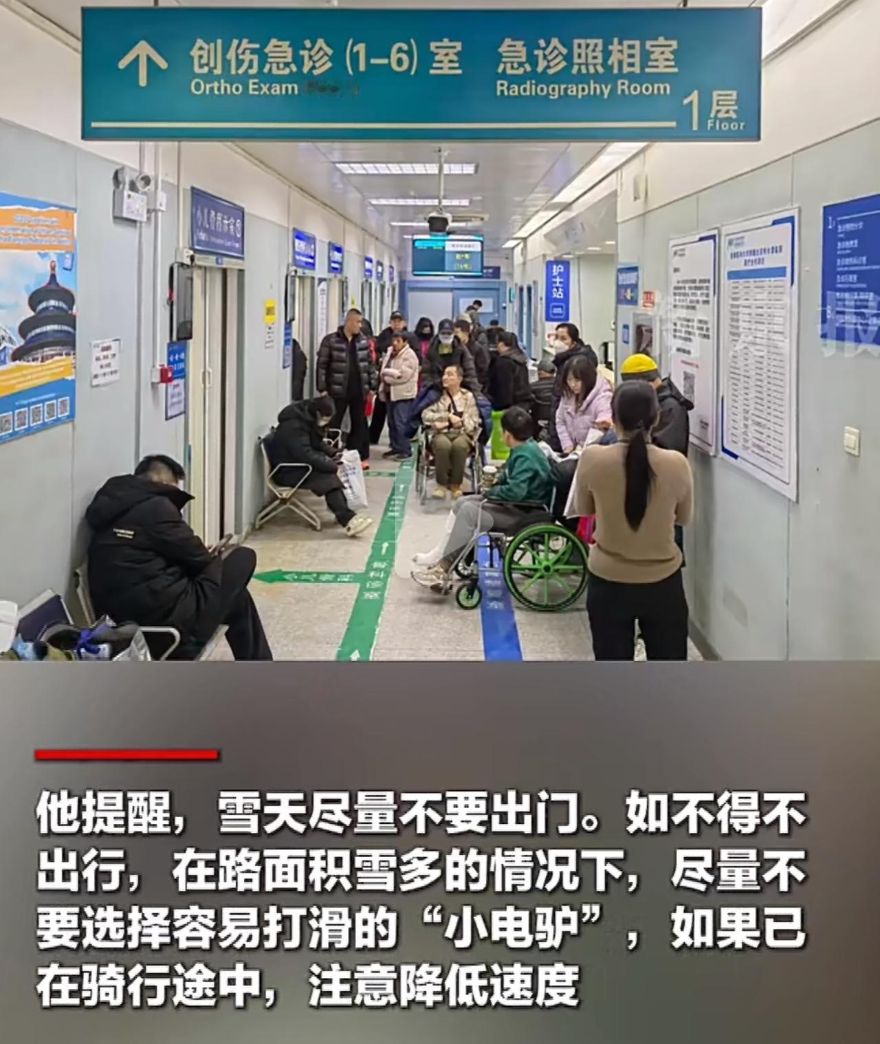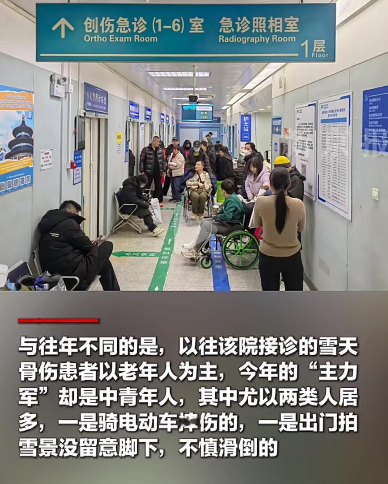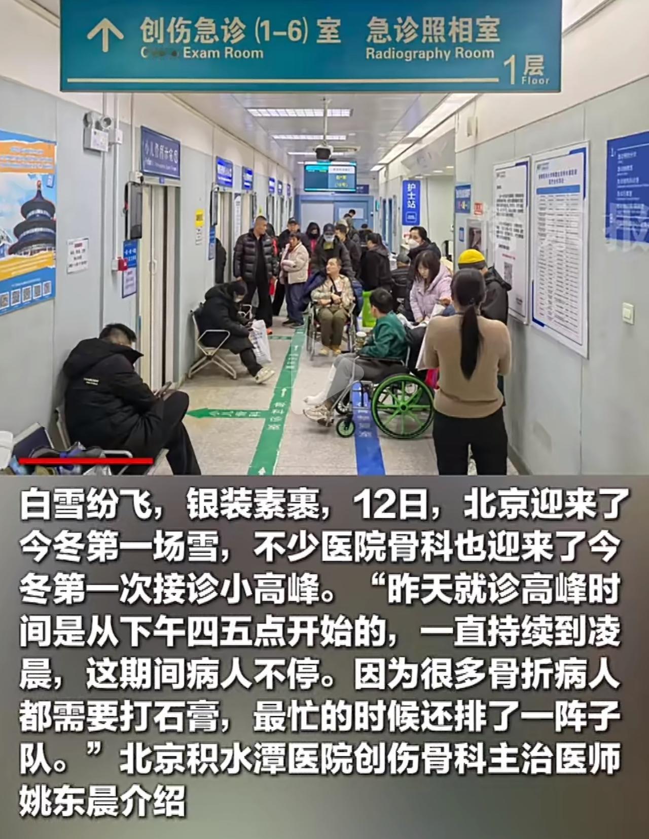 12月12号到13号这两天,医院的接诊量直接爆了,打石膏的地方排起了老长的队,接诊高峰从下午4点一直持续到凌晨,医护人员都忙得停不下来。仔细打听才知道,45%的人都是骑电动车摔的,雪后路面结了薄冰,车速稍微快一点,或者一着急刹车,车子就容易侧滑,甚至连人带车一起飞出去;还有35%是拍雪景的时候摔的,年轻人只顾着低头盯手机找好看的角度,要么频繁后退调整姿势,压根没注意大理石地砖、瓷砖路面滑得不行,一不留神就摔得人仰马翻,疼得直咧嘴。 这些摔伤的人里,大半都是手腕骨折,全是摔倒的时候下意识用手撑地造成的。其实雪天出门有不少防摔技巧,走路的时候学着企鹅的样子,双脚外八字、小步慢慢走,穿防滑的平底鞋,避开光滑的路面;真要是没稳住要摔倒,千万别用手撑地,侧身让臀部或者背部着地缓冲一下,就能少受点伤。 雪景再好看也比不上安全重要,不管是骑电动车通勤,还是出门赏雪拍照,都别掉以轻心。放慢脚步多留意脚下的路,别因为贪一时欢喜,最后摔得受伤受罪,真的太不划算了!医院现状 医院里的人百态 医院人多的原因
