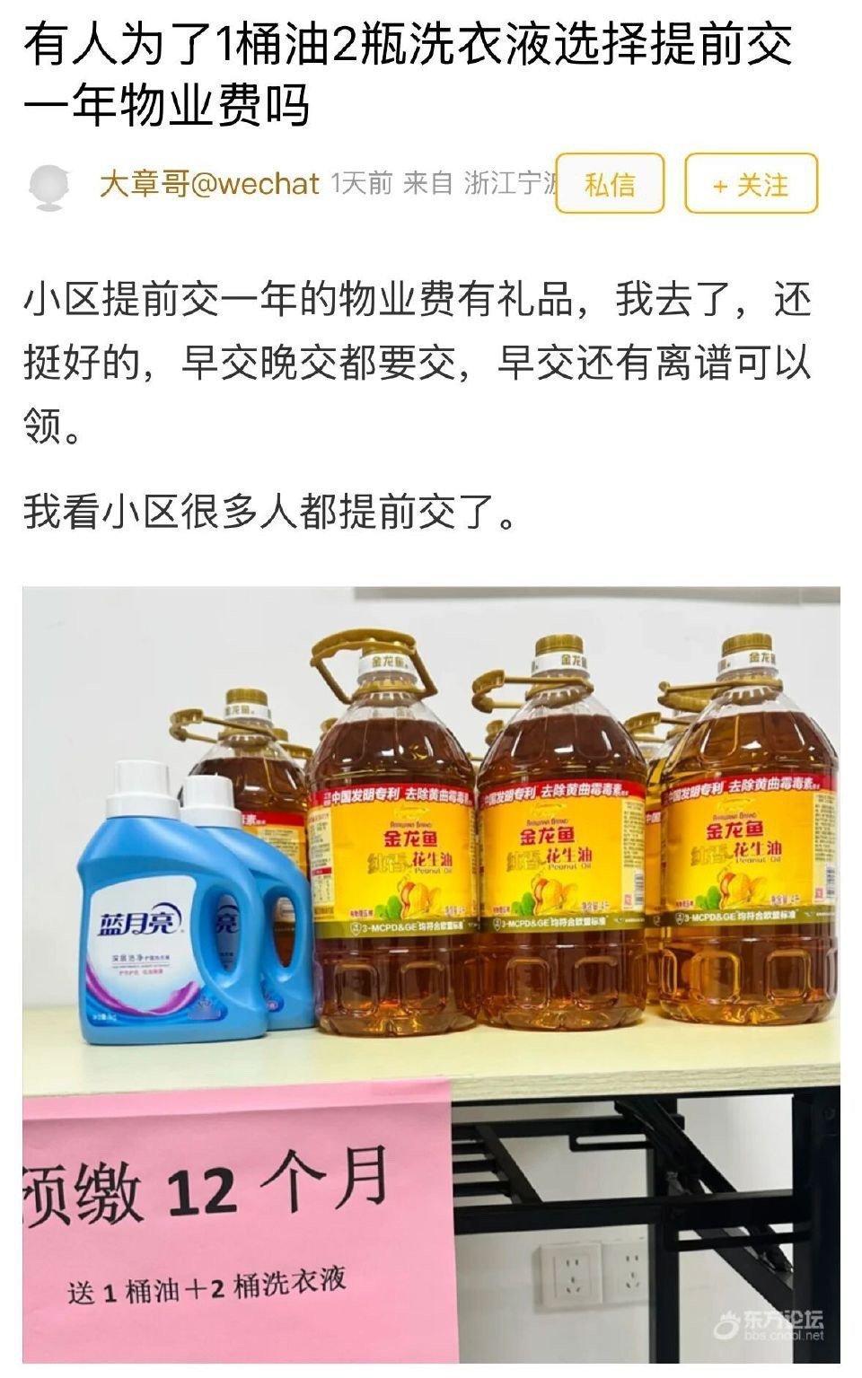 宁波一小区物业预缴物业费送礼遭质疑 宁波一小区物业“预缴送礼”遭质疑:表面让利,实则“羊毛出在业主身上”?年底将至,许多物业公司开始实施催费策略,力求快速回收物业费。日前,宁波网友“大章哥”发帖称自己小区提前交一年物业费,可以领一桶油和2瓶洗衣液。有网友认为这哪里是“送礼”,分明是用你的钱,买你的乖,还要你夸他好。你预缴了费,就等于提前放弃了对未来一年物业服务的监督权和议价权。大家觉得呢?同城热点创作计划