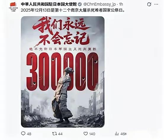 这次我们一个日本icon字都没写!中国驻日大使馆今天(12月13日)发文写道:2025年12月13日是第十二个南京大屠杀icon死难者国家公祭日, 30万同胞的生命定格在那个寒冬,中华门的弹孔、丛葬地的白骨,都是永远抹不去的伤痕。这些年,越来越多年轻人走进纪念馆,在留言簿上写下对逝者的缅怀,可仍有声音试图模糊这段历史。 幸存者们带着满身伤疤,一遍遍讲述亲身经历,哪怕每说一次都要难过好几天。他们腰背上的刺刀印记、脑海里亲人倒下的画面,都是最有力的证据,却有人不愿正视。 城市里的防空警报准时响起,行人驻足默哀,汽车鸣笛致哀,这一刻,悲痛穿越时空。但和平年代的我们,一边享受着安宁生活,一边要警惕那些试图篡改历史的举动。 国家公祭不是要延续仇恨,而是要铭记教训。纪念馆里的每一件文物、每一段证词,都在提醒世人,和平从来不是理所当然。我们铭记历史,是为了不让悲剧重演,更是为了守护当下的安稳。 年轻一代把历史故事讲给更多人听,学校里的公祭读本、网络上的在线祭奠,让这段记忆代代相传。那些试图掩盖真相的行为,在铁证面前终究不堪一击,因为真相永远不会被时间淹没。
